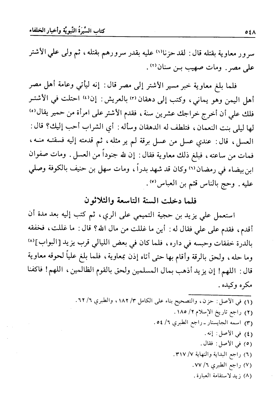 سرور معاوية بقتله قال: لقد حزنا «1» عليه بقدر سرورهم بقتله، ثم ولى علي الأشتر على مصر. ومات صهيب بن سنان «2» .