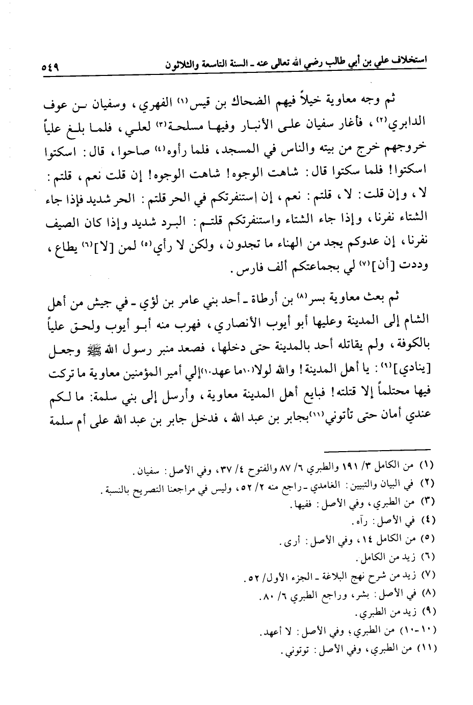 بن أرطاة- أحد بني عامر بن لؤي- في جيش من أهل الشام إلى المدينة وعليها أبو أيوب الأنصاري، فهرب منه أبو أيوب ولحق عليا بالكوفة، ولم يقاتله أحد بالمدينة حتى دخلها، فصعد منبر رسول الله صلى الله عليه وسلم وجعل [ينادي] «9» : يا أهل المدينة! والله لولا «10» ما عهد «10» إلي أمير المؤمنين معاوية ما تركت فيها محتلما إلا قتلته! فبايع أهل المدينة معاوية، وأرسل إلى بني سلمة: ما لكم عندي أمان حتى تأتوني «11» بجابر بن عبد الله، فدخل جابر بن عبد الله على أم سلمة