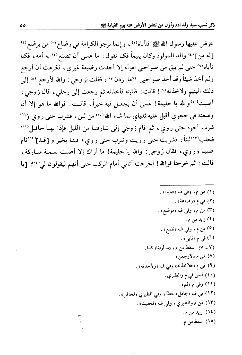 أصبت «10» والله يا حليمة! عسى أن يجعل فيه خيرا، قالت: فو الله ما هو إلا أن وضعته في حجري أقبل عليه ثدياي بما شاء الله «10» من لبن، فشرب حتى روي و «11» شرب أخوه حتى روي، ثم قام زوجي إلى شارفنا من الليل فإذا بها حافل «12» فحلب «13» لبنا، فشربت حتى رويت وشرب حتى روي؛ فبتنا بخير و [قد] 1»