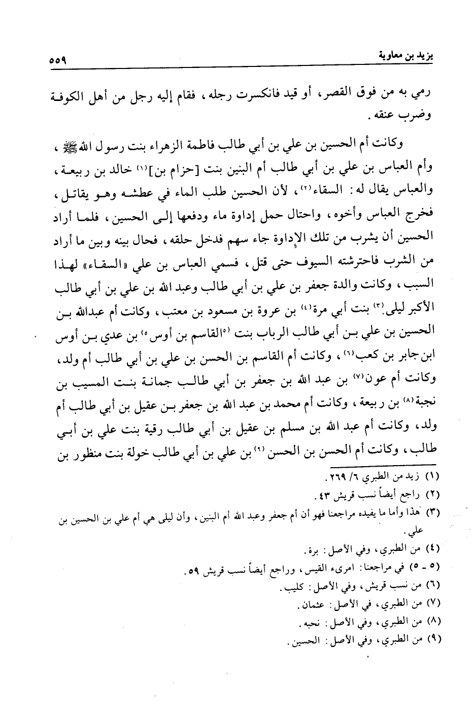 وكانت أم الحسين بن علي بن أبي طالب فاطمة الزهراء بنت رسول الله صلى الله عليه وسلم، وأم العباس بن علي بن أبي طالب أم البنين بنت [حزام بن] «1» خالد بن ربيعة، والعباس يقال له: السقاء «2» ، لأن الحسين طلب الماء في عطشه وهو يقاتل، فخرج العباس وأخوه، واحتال حمل إداوة ماء ودفعها إلى الحسين، فلما أراد الحسين أن يشرب من تلك الإداوة جاء سهم فدخل حلقه، فحال بينه وبين ما أراد من الشرب فاحترشته السيوف حتى قتل، فسمي العباس بن علي «السقاء» لهذا السبب، وكانت والدة جعفر بن علي بن أبي طالب وعبد الله بن علي بن أبي طالب الأكبر ليلى «3» بنت أبي مرة «4» بن عروة بن مسعود بن معتب، وكانت أم عبد الله بن الحسين بن علي بن أبي طالب الرباب بنت «5» القاسم بن أوس «5» بن عدي بن أوس ابن جابر بن كعب «6» ، وكانت أم القاسم بن الحسن بن علي بن أبي طالب أم ولد، وكانت أم عون «7» بن عبد الله بن جعفر بن أبي طالب جمانة بنت المسيب بن نجبة «8» بن ربيعة، وكانت أم محمد بن عبد الله بن جعفر بن عقيل بن أبي طالب أم ولد، وكانت أم عبد الله بن مسلم بن عقيل بن أبي طالب رقية بنت علي بن أبي طالب، وكانت أم الحسن بن الحسن»