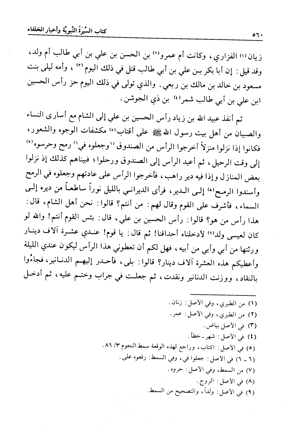 ثم أنفذ عبيد الله بن زياد رأس الحسين بن علي إلى الشام مع أسارى النساء والصبيان من أهل بيت رسول الله صلى الله عليه وسلم على أقتاب «5» مكشفات الوجوه والشعور، فكانوا إذا نزلوا منزلا أخرجوا الرأس من الصندوق «6» وجعلوه في «6» رمح وحرسوه «7» إلى وقت الرحيل، ثم أعيد الرأس إلى الصندوق ورحلوا؛ فبيناهم كذلك إذ نزلوا بعض المنازل وإذا فيه دير راهب، فأخرجوا الرأس على عادتهم وجعلوه في الرمح وأسندوا الرمح «8» إلى الدير، فرأى الديراني بالليل نورا ساطعا من ديره إلى السماء، فأشرف على القوم وقال لهم: من أنتم؟ قالوا: نحن أهل الشام، قال:
