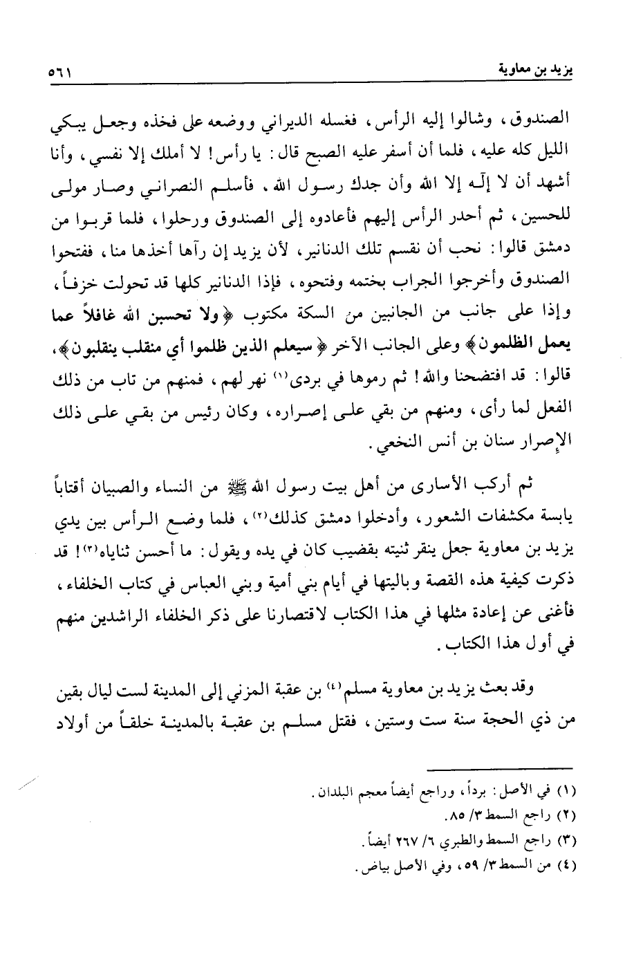 ثم أركب الأسارى من أهل بيت رسول الله صلى الله عليه وسلم من النساء والصبيان أقتابا يابسة مكشفات الشعور، وأدخلوا دمشق كذلك «2» ، فلما وضع الرأس بين يدي يزيد بن معاوية جعل ينقر ثنيته بقضيب كان في يده ويقول: ما أحسن ثناياه «3» ! قد ذكرت كيفية هذه القصة وباليتها في أيام بني أمية وبني العباس في كتاب الخلفاء، فأغنى عن إعادة مثلها في هذا الكتاب لاقتصارنا على ذكر الخلفاء الراشدين منهم في أول هذا الكتاب.