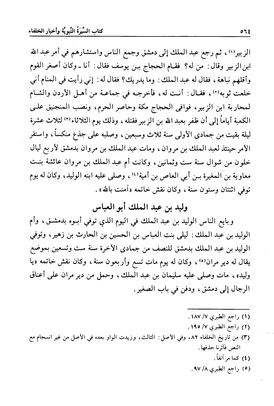 وبايع الناس الوليد بن عبد الملك في اليوم الذي توفي أبوه بدمشق، وأم الوليد بن عبد الملك: ليلى بنت العباس بن الحسين بن الحارث بن زهير، وتوفي الوليد بن عبد الملك بدمشق للنصف من جمادى الآخرة سنة ست وتسعين بموضع يقال له دير مران»