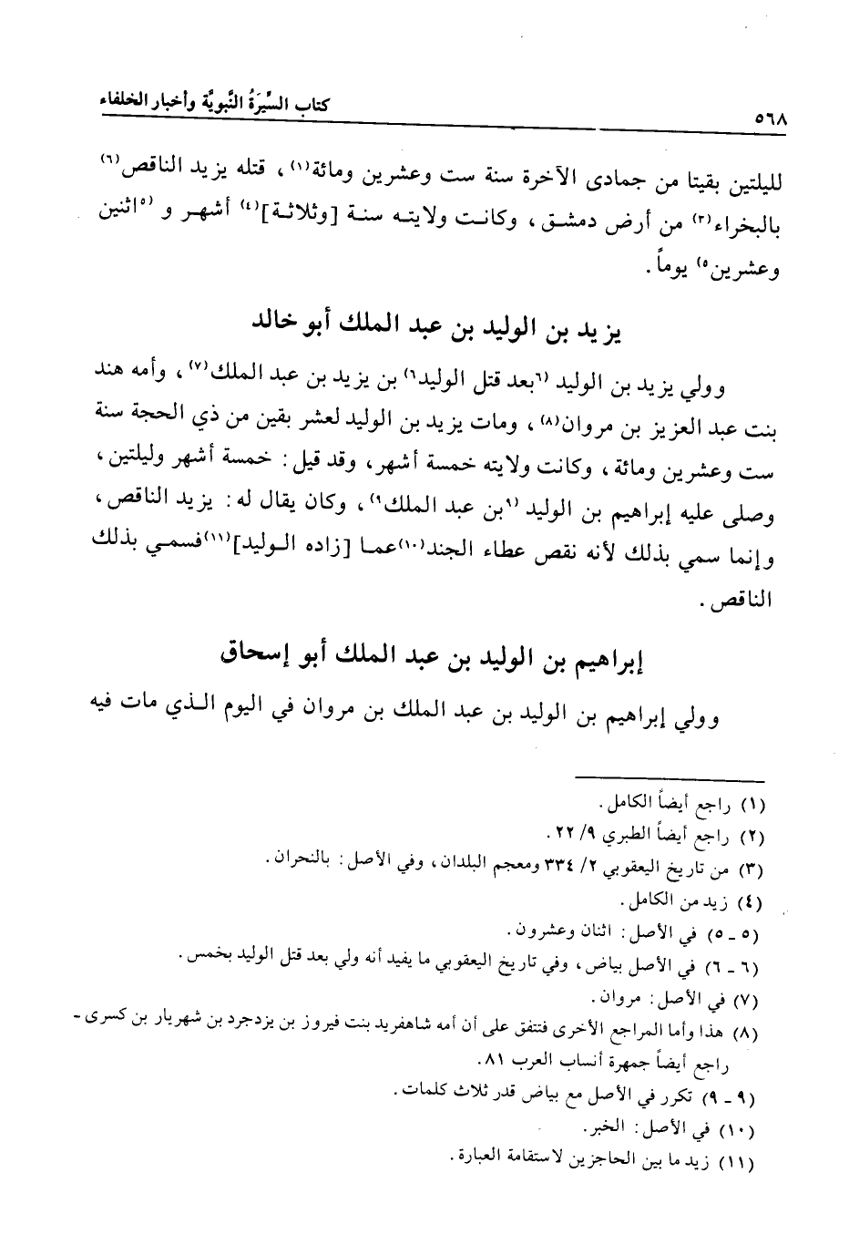 وولي يزيد بن الوليد «6» بعد قتل الوليد «6» بن يزيد بن عبد الملك «7» ، وأمه هند بنت عبد العزيز بن مروان «8» ، ومات يزيد بن الوليد لعشر بقين من ذي الحجة سنة ست وعشرين ومائة، وكانت ولايته خمسة أشهر، وقد قيل: خمسة أشهر وليلتين، وصلى عليه إبراهيم بن الوليد «9» بن عبد الملك «9» ، وكان يقال له: يزيد الناقص، وإنما سمي بذلك لأنه نقص عطاء الجند «10» عما [زاده الوليد] «11» فسمي بذلك الناقص.