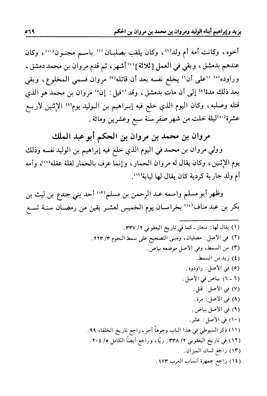 أخوه، وكانت أمه أم ولد «1» ، وكان يلقب بصلبان «2» باسم مجنون «3» ، وكان عندهم بدمشق، وبقي في العمل [ثلاثة] «4» أشهر، ثم قدم مروان بن محمد دمشق، وراوده «5» «6» على أن «6» يخلع نفسه بعد أن قاتله «7» مروان فسمي المخلوع، وبقي بعد ذلك مدة «8» إلى أن مات بدمشق، وقد «9» قيل: إن مروان بن محمد هو الذي قتله وصلبه، وكان اليوم الذي خلع فيه إبراهيم بن الوليد يوم «9» الإثنين لأربع عشرة «10» ليلة خلت من شهر صفر سنة سبع وعشرين ومائة.