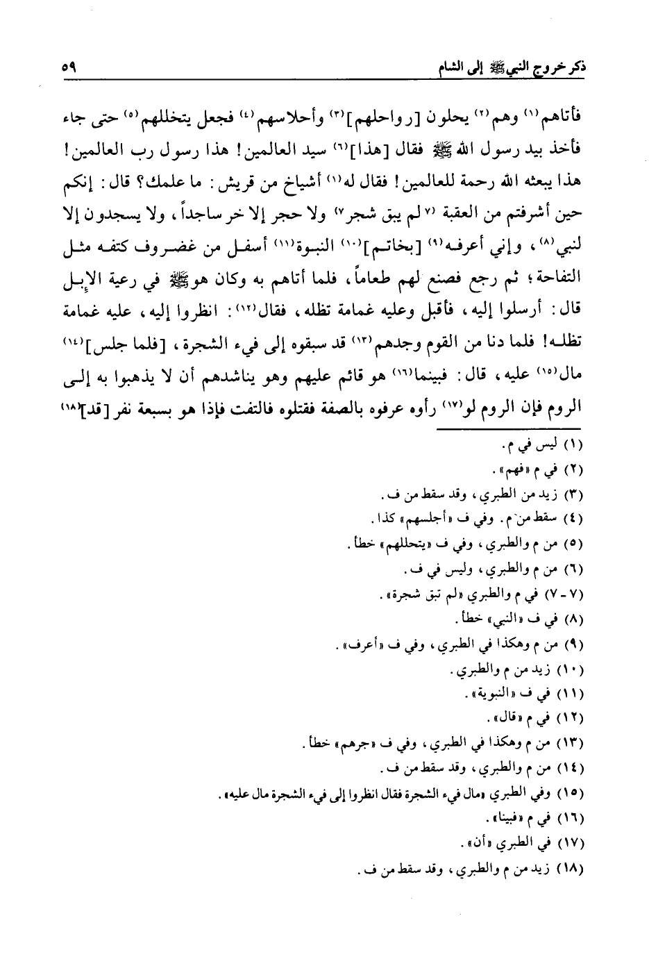 فأتاهم «1» وهم «2» يحلون [رواحلهم] «3» وأحلاسهم «4» فجعل يتخللهم «5» حتى جاء فأخذ بيد رسول الله صلى الله عليه وسلم فقال [هذا] «6» سيد العالمين! هذا رسول رب العالمين! هذا يبعثه الله رحمة للعالمين! فقال له «1» أشياخ من قريش: ما علمك؟ قال: إنكم حين أشرفتم من العقبة «7» يبق شجر 7 ولا حجر إلا خر ساجدا، ولا يسجدون إلا لنبي «8» ، وإني أعرفه «9» [بخاتم] «10» النبوة «11» أسفل من غضروف كتفه مثل التفاحة؛ ثم رجع فصنع لهم طعاما، فلما أتاهم به وكان هو صلى الله عليه وسلم في رعية الإبل قال: أرسلوا إليه، فأقبل وعليه غمامة تظله، فقال «12» : انظروا إليه، عليه غمامة تظله! فلما دنا من القوم وجدهم «13» قد سبقوه إلى فيء الشجرة، [فلما جلس] «14» مال «15» عليه، قال: فبينما «16»