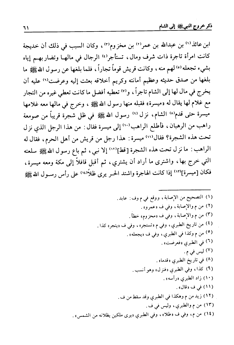 ابن عائذ «1» بن عبد الله بن عمر «2» بن مخزوم «3» ، وكان السبب في ذلك أن خديجة كانت امرأة تاجرة ذات شرف ومال، تستأجر «4» الرجال في مالها وتضاربهم إياه بشيء تجعله «5» لهم منه، وكانت قريش قوما تجارا، فلما بلغها عن رسول الله صلى الله عليه وسلم ما بلغها من صدق حديثه وعظيم أمانته وكريم أخلاقه بعثت إليه وعرضت «6» عليه أن يخرج في مال لها إلى الشام تاجرا، و «7» تعطيه أفضل ما كانت تعطي غيره من التجار مع غلام لها يقال له «ميسرة» فقبله منها رسول الله صلى الله عليه وسلم، وخرج في مالها معه غلامها ميسرة حتى قدم «8» الشام، نزل «9» رسول الله صلى الله عليه وسلم في ظل شجرة قريبا من صومعة راهب من الرهبان، فأطلع الراهب «10» إلى ميسرة فقال: من هذا الرجل الذي نزل تحت هذه الشجرة؟ فقال «11» ميسرة: هذا رجل من قريش من أهل الحرم، فقال له الراهب: ما نزل تحت هذه الشجرة [قط] «12» إلا نبي، ثم باع رسول الله صلى الله عليه وسلم سلعته التي خرج بها، واشترى ما أراد أن يشتري، ثم أقبل قافلا إلى مكة ومعه ميسرة، فكان [ميسرة] «13» إذا كانت الهاجرة واشتد الحريرى ظلا «14» على رأس رسول الله صلى الله عليه وسلم