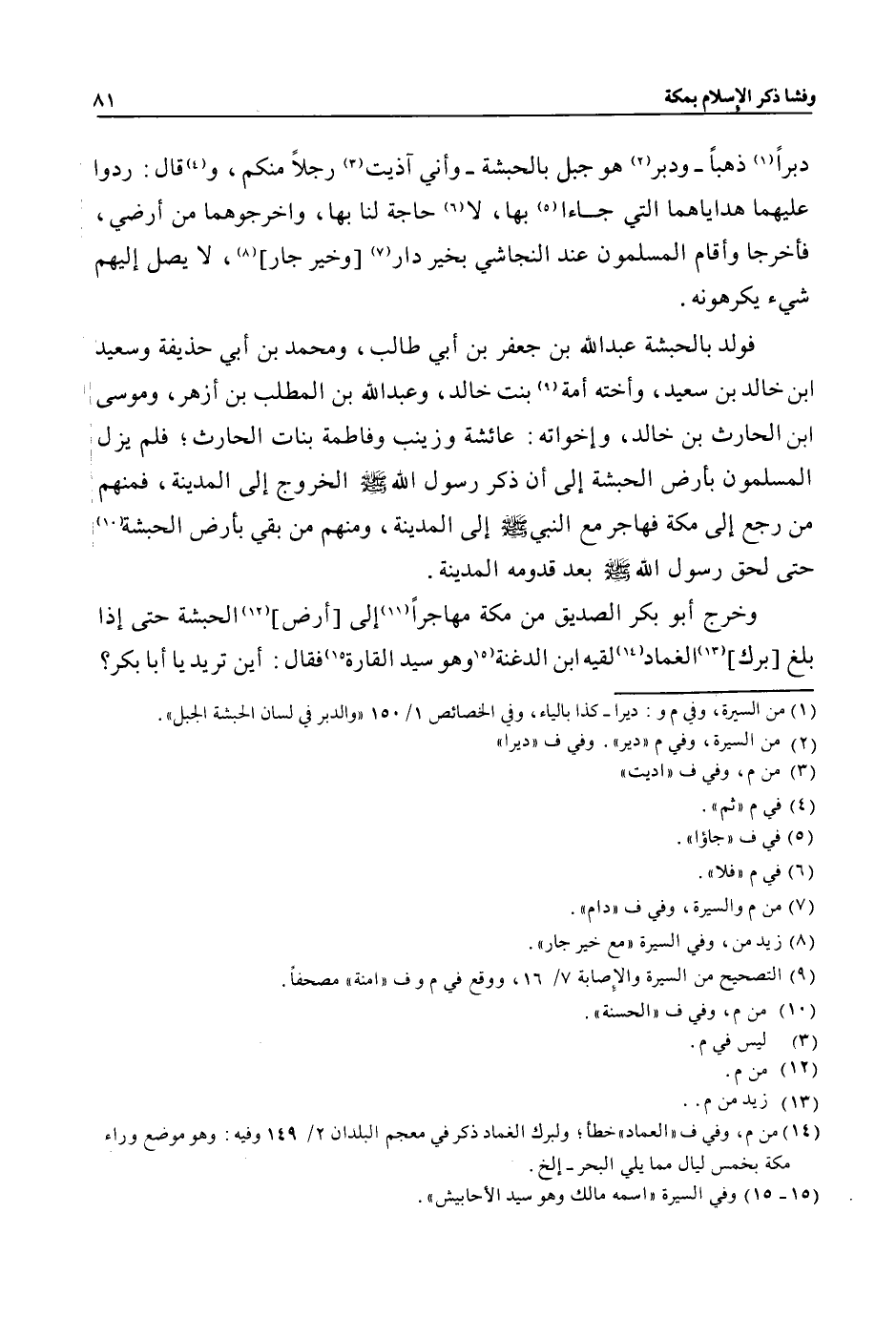 وخرج أبو بكر الصديق من مكة مهاجرا «11» إلى [أرض] «12» الحبشة حتى إذا بلغ [برك] «13» الغماد «14» لقيه ابن الدغنة «15» وهو سيد القارة «15» فقال: أين تريد يا أبا بكر؟