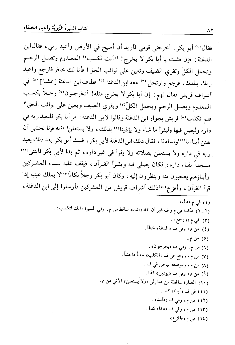 فقال «1» أبو بكر: أخرجني قومي فأريد أن أسيح في الأرض وأعبد ربي، فقال ابن الدغنة: فإن مثلك يا أبا بكر لا يخرج! «2» أنت تكسب «2» المعدوم وتصل الرحم وتحمل الكلّ وتقري الضيف وتعين على نوائب الحق! فأنا لك خافر فارجع واعبد ربك ببلدك، فرجع وارتحل «3» معه ابن الدغنة «4» فطاف ابن الدغنة [عشية] «5» في أشراف قريش فقال لهم: إن أبا بكر لا يخرج مثله! أتخرجون «6» رجلا يكسب المعدوم ويصل الرحم ويحمل الكلّ «7» ويقري الضيف ويعين على نوائب الحق؟