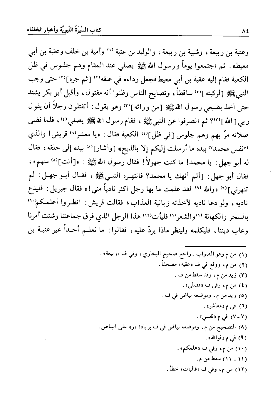 وعتبة بن ربيعة، وشيبة بن ربيعة، والوليد بن عتبة «1» وأمية بن خلف وعقبة بن أبي معيط» . ثم اجتمعوا يوما ورسول الله صلى الله عليه وسلم يصلي عند المقام وهم جلوس في ظل الكعبة فقام إليه عقبة بن أبي معيط فجعل رداءه في عنقه «2» [ثم جره] «3» حتى وجب النبي صلى الله عليه وسلم [لركبته] «3» ساقطا، وتصايح الناس وظنوا أنه مقتول، وأقبل أبو بكر يشتد حتى أخذ بضبعي رسول الله صلى الله عليه وسلم [من ورائه] «3» وهو يقول: أتقتلون رجلا أن يقول ربي [الله] «3» ؟ ثم انصرفوا عن النبي صلى الله عليه وسلم، فقام رسول الله صلى الله عليه وسلم يصلي «4» ، فلما قضى صلاته مرّ بهم وهم جلوس [في ظل] «5» الكعبة فقال: «يا معشر «6» قريش! والذي «7» نفس محمد «7» بيده ما أرسلت إليكم إلا بالذبح» [وأشار] «8» بيده إلى حلقه، فقال له أبو جهل: يا محمد! ما كنت جهولا! فقال رسول الله صلى الله عليه وسلم: « [أنت] «5» منهم» ، فقال أبو جهل: [ألم أنهك يا محمد؟ فانتهره النبي صلى الله عليه وسلم، فقال أبو جهل: لم تنهرني] «3» «والله «9» لقد علمت ما بها رجل أكثر ناديا مني!» فقال جبريل: فليدع ناديه، ولو دعا ناديه لأخذته زبانية العذاب؛ فقالت قريش: انظروا أعلمكم «10» بالسحر والكهانة «11» والشعر «11» فليأت «12» هذا الرجل الذي فرق جماعتنا وشتت أمرنا وعاب ديننا، فليكلمه ولينظر ماذا يردّ عليه، فقالوا: ما نعلم أحدا غير عتبة بن
