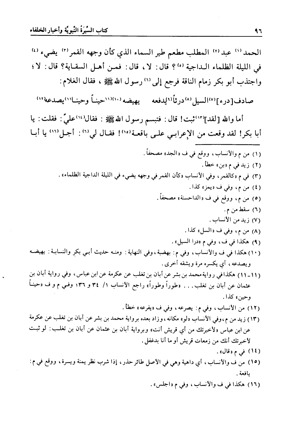 الحمد «1» عبد «2» المطلب مطعم طير السماء الذي كأن وجهه القمر «3» يضيء «4» في الليلة الظلماء الداجية «5» ؟ قال: لا، قال: فمن أهل السقاية؟ قال: لا؛ واجتذب أبو بكر زمام الناقة فرجع إلى «6» رسول الله صلى الله عليه وسلم، فقال الغلام: