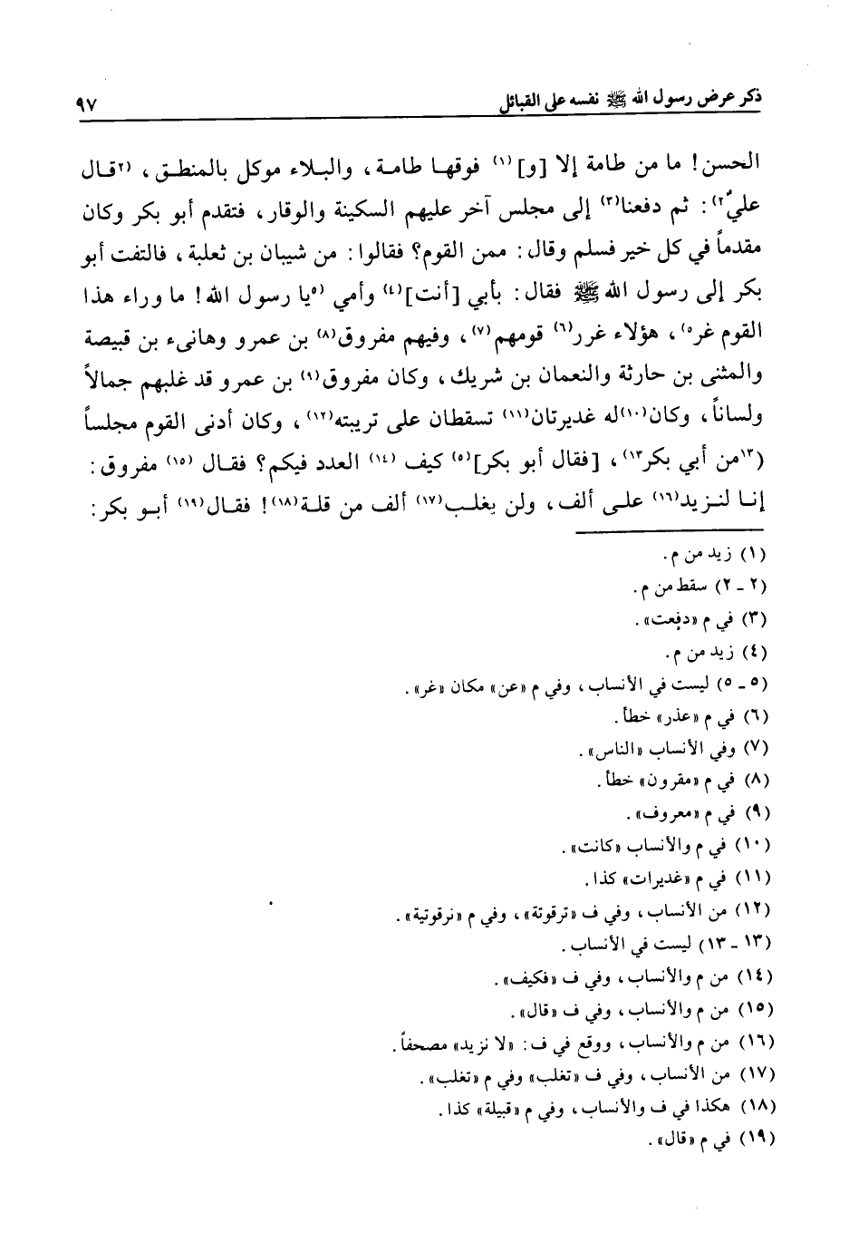 الحسن! ما من طامة إلا [و] «1» فوقها طامة، والبلاء موكل بالمنطق، «2» قال علي «2» : ثم دفعنا «3» إلى مجلس آخر عليهم السكينة والوقار، فتقدم أبو بكر وكان مقدما في كل خير فسلم وقال: ممن القوم؟ فقالوا: من شيبان بن ثعلبة، فالتفت أبو بكر إلى رسول الله صلى الله عليه وسلم فقال: بأبي [أنت] «4» وأمي «5» يا رسول الله! ما وراء هذا القوم غر «5» ، هؤلاء غرر «6» قومهم «7» ، وفيهم مفروق «8» بن عمرو وهانىء بن قبيصة والمثنى بن حارثة والنعمان بن شريك، وكان مفروق «9» بن عمرو قد غلبهم جمالا ولسانا، وكان «10» له غديرتان «11» تسقطان على تريبته «12» ، وكان أدنى القوم مجلسا ( «13» من أبي بكر «13» ، [فقال أبو بكر] «5» كيف «14» العدد فيكم؟ فقال «15» مفروق: