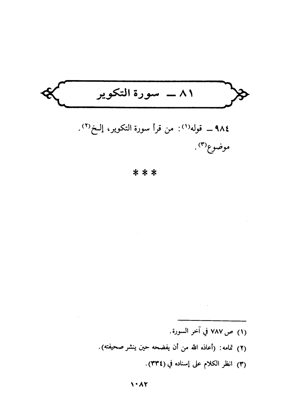 984 - قَوْله: من قَرَأَ سُورَة التكوير، إِلَخ.