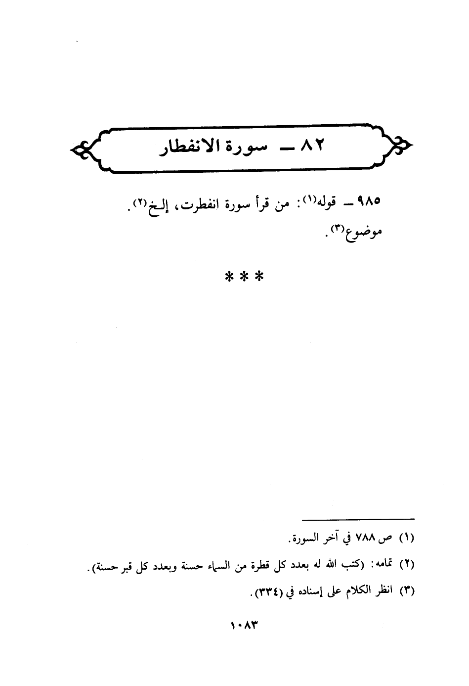 985 - قَوْله: من قَرَأَ سُورَة انفطرت، إِلَخ.
