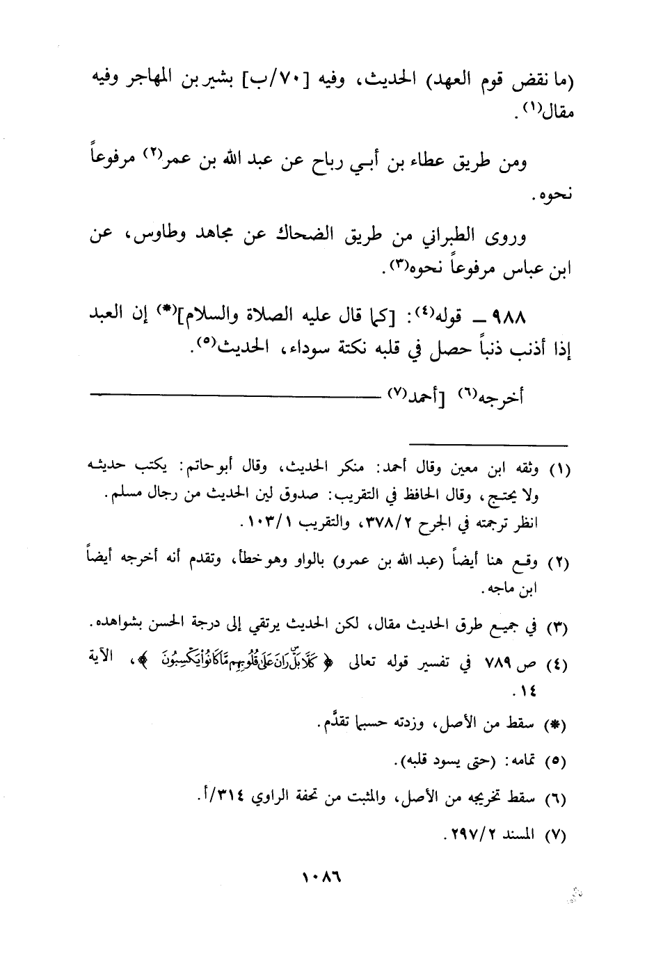 988 - قَوْله: [كَمَا قَالَ عَلَيْهِ الصَّلَاة وَالسَّلَامُ] إِن العَبْد إِذا أذْنب ذَنبا حصل فِي قلبه نُكْتَة سَوْدَاء، الحَدِيث.