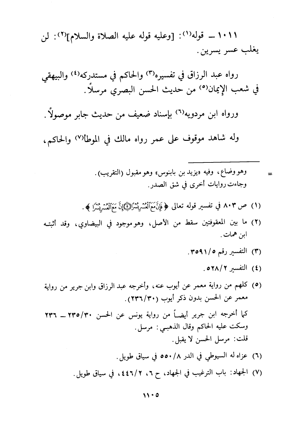 1011 - قَوْله: [وَعَلِيهِ قَوْله عَلَيْهِ الصَّلَاة وَالسَّلَامُ] :لن يغلب عسر يسرين.