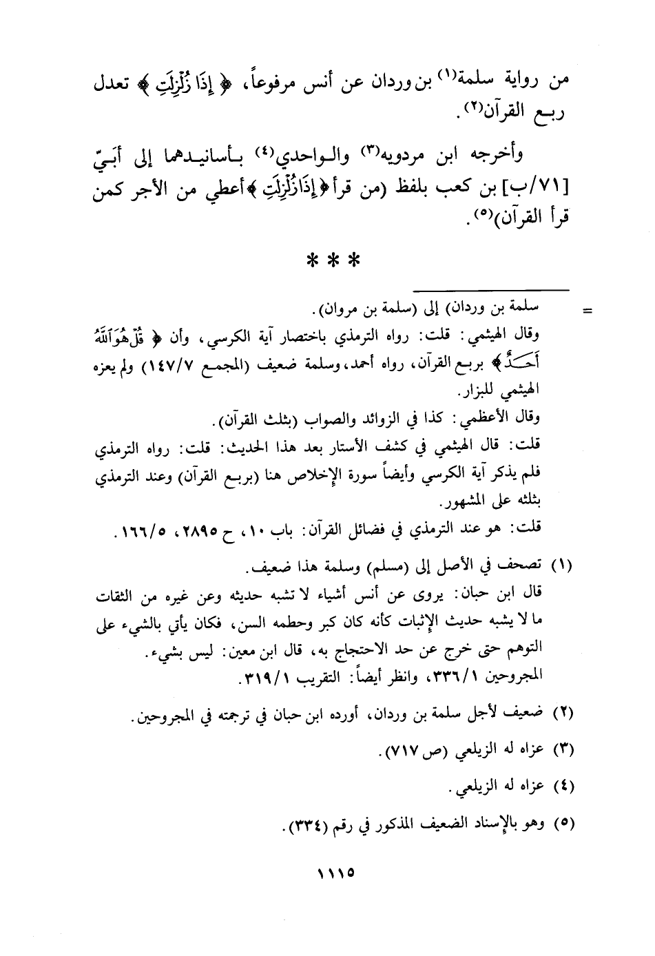 من رِوَايَة سَلمَة بن وردان عَن أنس مَرْفُوعا، (إِذا زلزلت) تعدل ربع الْقُرْآن.