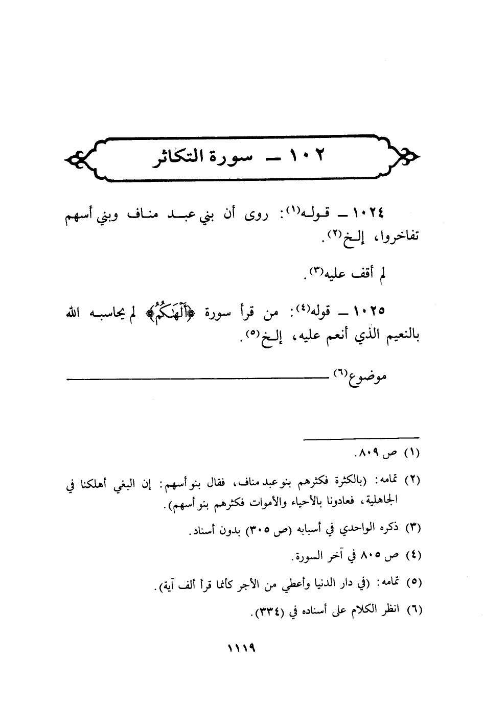 1025 - قَوْله: من قَرَأَ سُورَة (ألهكم) لم يحاسبه الله بالنعيم الَّذِي أنعم عَلَيْهِ، إِلَخ.
