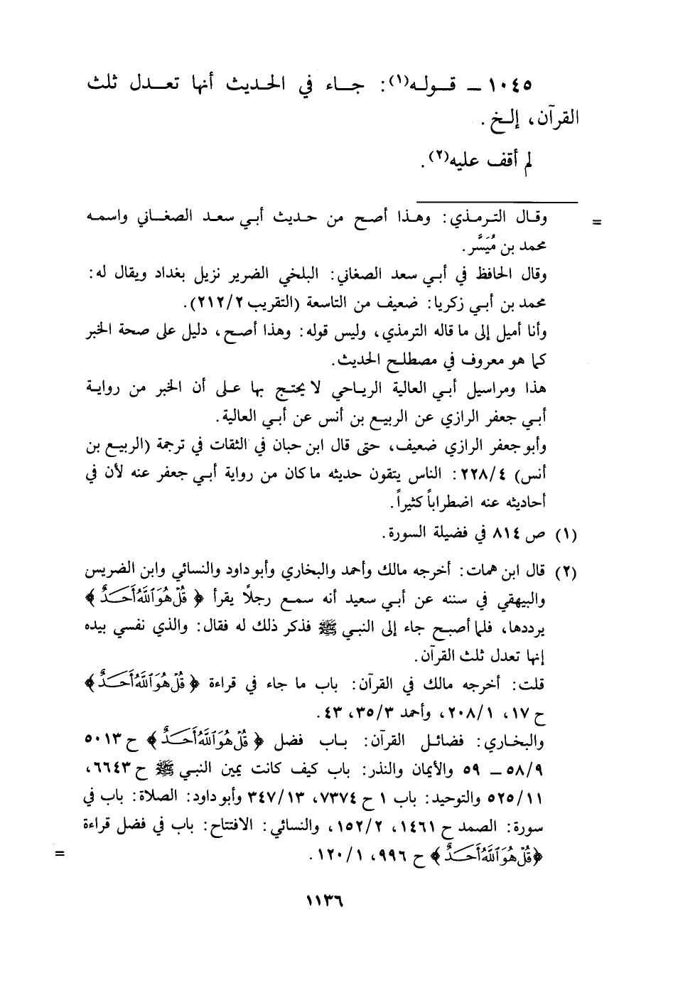 1045 - قَوْله: جَاءَ فِي الحَدِيث أَنَّهَا تعدل ثلث الْقُرْآن، إِلَخ.