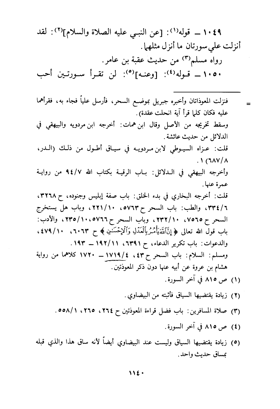 1049 - قَوْله: [عَن النَّبِي عَلَيْهِ الصَّلَاة وَالسَّلَامُ] : لقد أنزلت عَلّي سورتان مَا أنزل مثلهمَا.