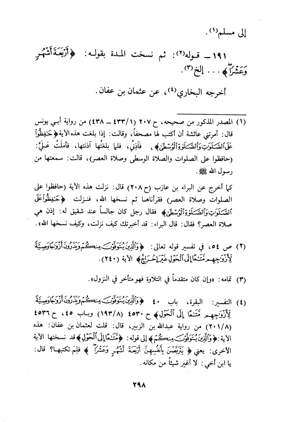 191 - قَوْله: ثمَّ نسخت الْمدَّة بقوله: (أَرْبَعَة أشهر وَعشرا)