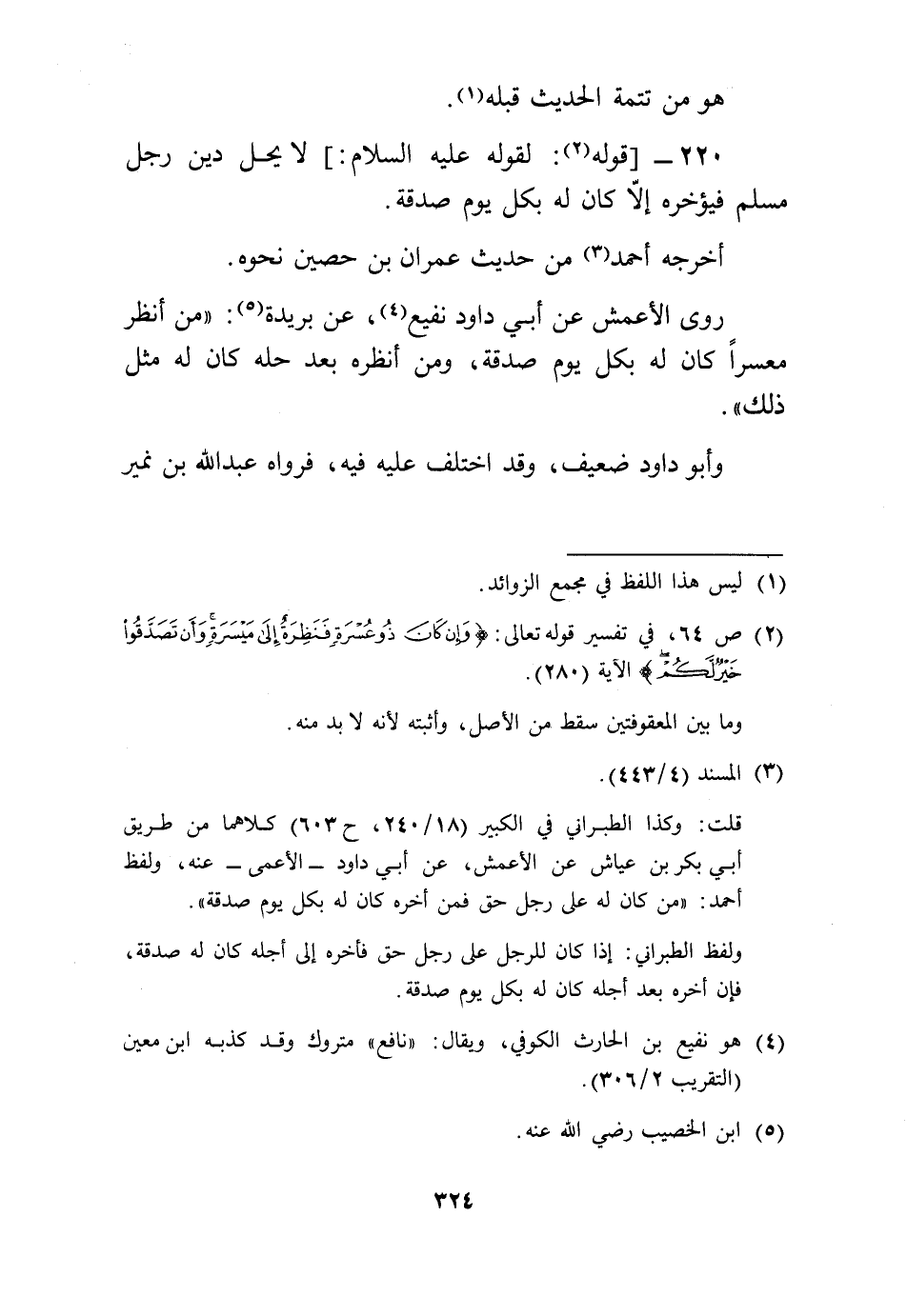 220 -[قَوْله: لقَوْله عَلَيْهِ السَّلَام:] لَا يحل دين رجل مُسلم فيؤخره إِلَّا كَانَ لَهُ بِكُل يَوْم صَدَقَة.