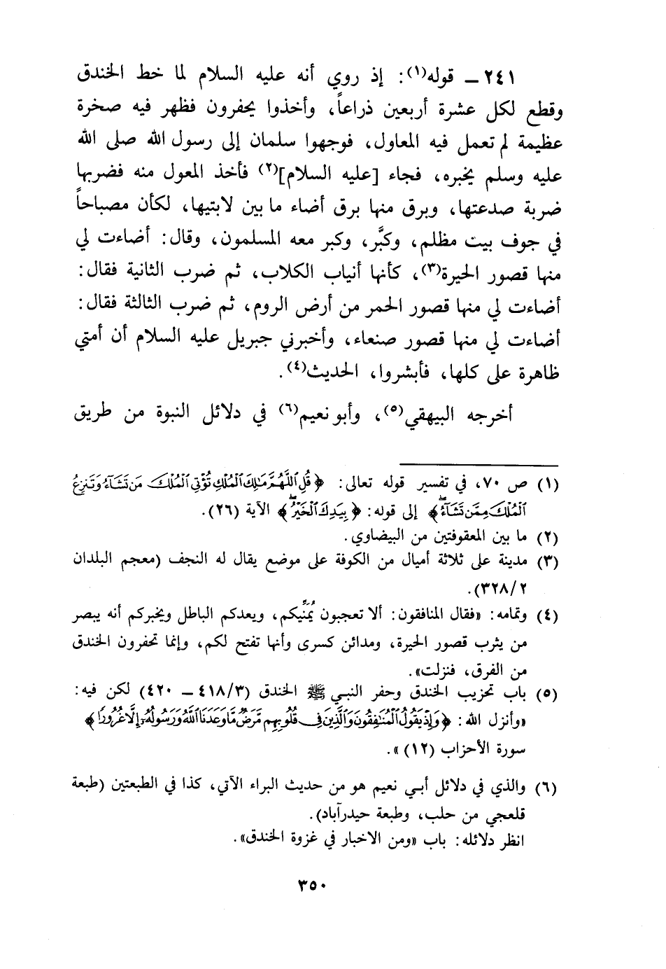 241 - قَوْله: إِذْ رُوِيَ أَنه عَلَيْهِ السَّلَام لما خطّ الخَنْدَق وَقطع لكل عشرَة أَرْبَعِينَ ذِرَاعا، وَأخذُوا يحفرون فَظهر فِيهِ صَخْرَة عَظِيمَة لم تعْمل فِيهِ المعاول، فوجهوا سلمَان إِلَى رَسُول الله صَلَّى اللَّهُ عَلَيْهِ وَسَلَّم َ يُخبرهُ، فجَاء [عَلَيْهِ السَّلَام] فَأخذ الْمعول مِنْهُ فضربها ضَرْبَة صدعتها، وبرق مِنْهَا برق أَضَاء مَا بَين لابتيها، لكأن مصباحا فِي جَوف بَيت مظلم، وَكبر، وَكبر مَعَه الْمُسلمُونَ، وَقَالَ: أَضَاءَت لي مِنْهَا قُصُور الْحيرَة، كَأَنَّهَا أَنْيَاب الْكلاب، ثمَّ ضرب الثَّانِيَة فَقَالَ: أَضَاءَت لي مِنْهَا قُصُور الْحمر من أَرض الرّوم، ثمَّ ضرب الثَّالِثَة فَقَالَ: أَضَاءَت لي مِنْهَا قُصُور صنعاء، وَأَخْبرنِي جِبْرِيل عَلَيْهِ السَّلَام أَن أمتِي ظَاهِرَة عَلَى كلهَا، فأبشروا، الحَدِيث.