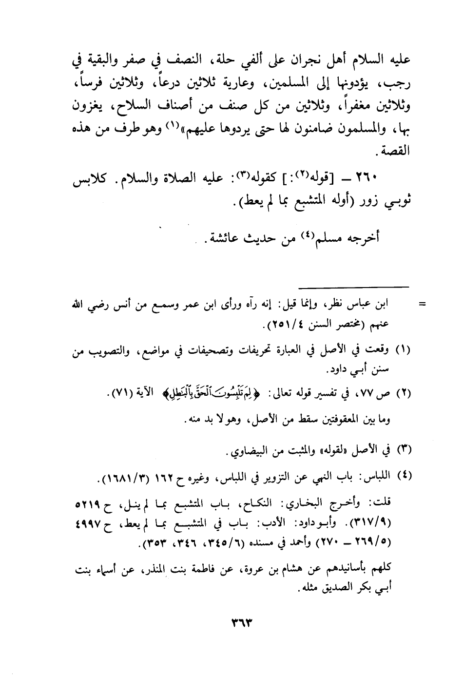 عَلَيْهِ السَّلَام أهل نَجْرَان عَلَى ألفي حلَّة، النّصْف فِي صفر والبقية فِي رَجَب، يؤدونها إِلَى الْمُسلمين، وعارية ثَلَاثِينَ درعا، وَثَلَاثِينَ فرسا، وَثَلَاثِينَ مغفرا، وَثَلَاثِينَ من كل صنف من أَصْنَاف السِّلَاح، يغزون بهَا، والمسلمون ضامنون لَهَا حَتَّى يردوها عَلَيْهِم» وَهُوَ طرف من هَذِه الْقِصَّة.