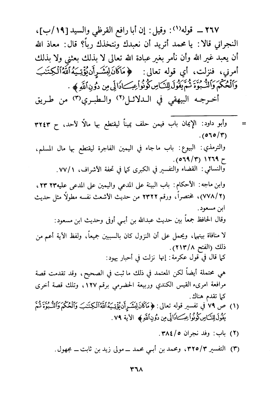 267 - قَوْله: وَقيل إِن أَبَا رَافع الْقرظِيّ وَالسَّيِّد [19/ب] ، النجراني قَالَا: يَا مُحَمَّد أَتُرِيدُ أَن نعبدك ونتخذك رَبًّا؟ قَالَ:معَاذ الله أَن يعبد غير الله وَأَن نأمر بِغَيْر عبَادَة الله تَعَالَى لَا بذلك بَعَثَنِي وَلَا بذلك أَمرنِي، فَنزلت، أَي قَوْله تَعَالَى: (مَا كَانَ لبشر أَن يؤتيه الله الْكتب وَالْحكم والنبوة ثمَّ يَقُول للنَّاس كونُوا عبادا لي من دون الله) .