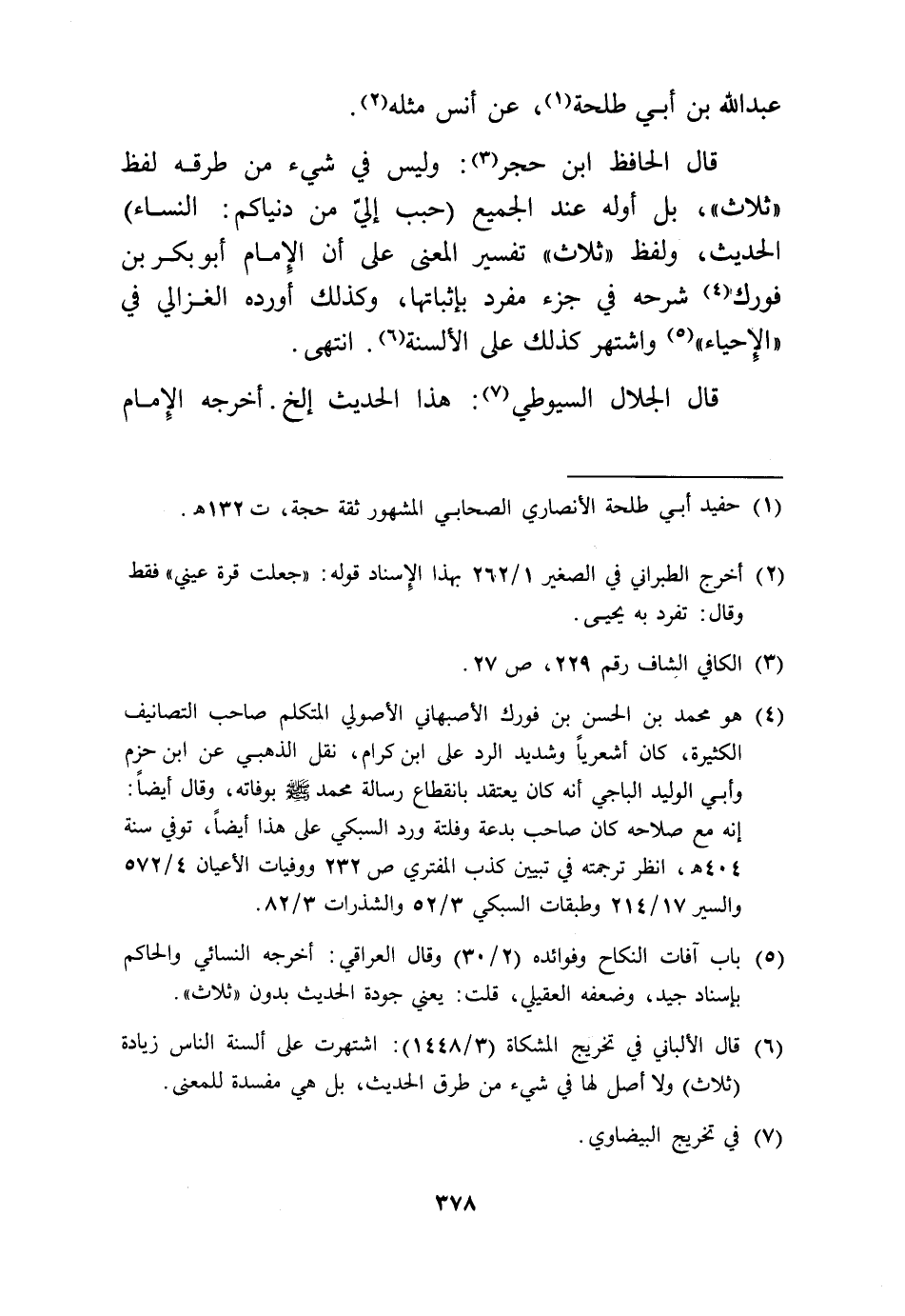 قَالَ الْحَافِظ ابْن حجر: وَلَيْسَ فِي شَيْء من طرقه لفظ «ثَلَاث» ، بل أَوله عِنْد الْجَمِيع (حبب إِلَيّ من دنياكم: النِّسَاء) الحَدِيث، وَلَفظ «ثَلَاث» تَفْسِير الْمَعْنى عَلَى أَن الإِمَام أَبُو بكر بن فورك شَرحه فِي جُزْء مُفْرد بإثباتها، وَكَذَلِكَ أوردهُ الْغَزالِيّ فِي «الْإِحْيَاء» واشتهر كَذَلِك عَلَى الْأَلْسِنَة. انْتَهَى.