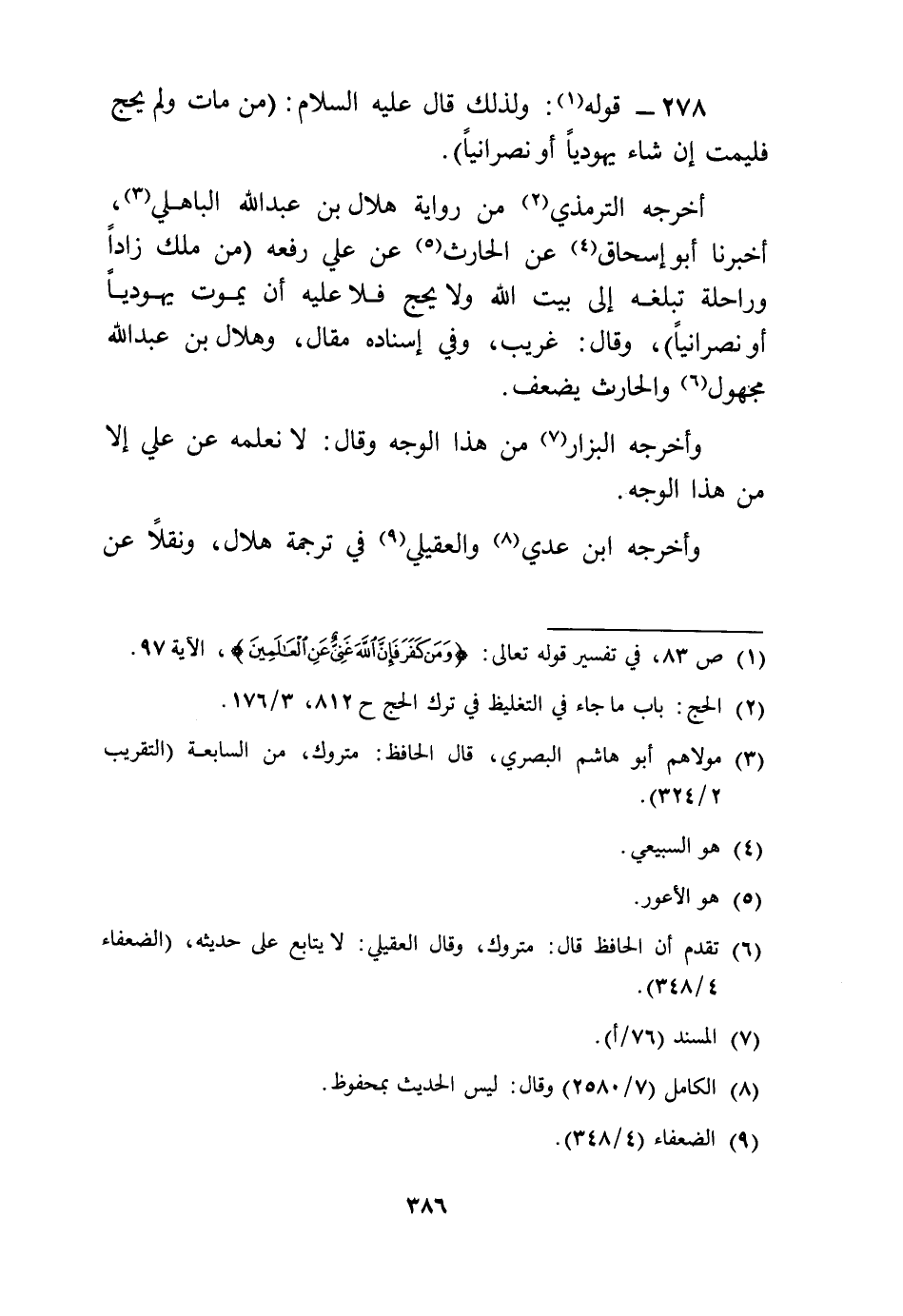 أخرجه التِّرْمِذِيّ من رِوَايَة هِلَال بن عبد الله الْبَاهِلِيّ، أخبرنَا أَبُو إِسْحَاق عَن الْحَارِث عَن عَلّي رَفعه (من ملك زادا وراحلة تبلغه إِلَى بَيت الله وَلَا يحجّ فَلَا عَلَيْهِ أَن يَمُوت يَهُودِيّا أَو نَصْرَانِيّا) ، وَقَالَ: غَرِيب، وَفِي إِسْنَاده مقَال، وهلال بن عبد الله مَجْهُول والْحَارث يضعف.