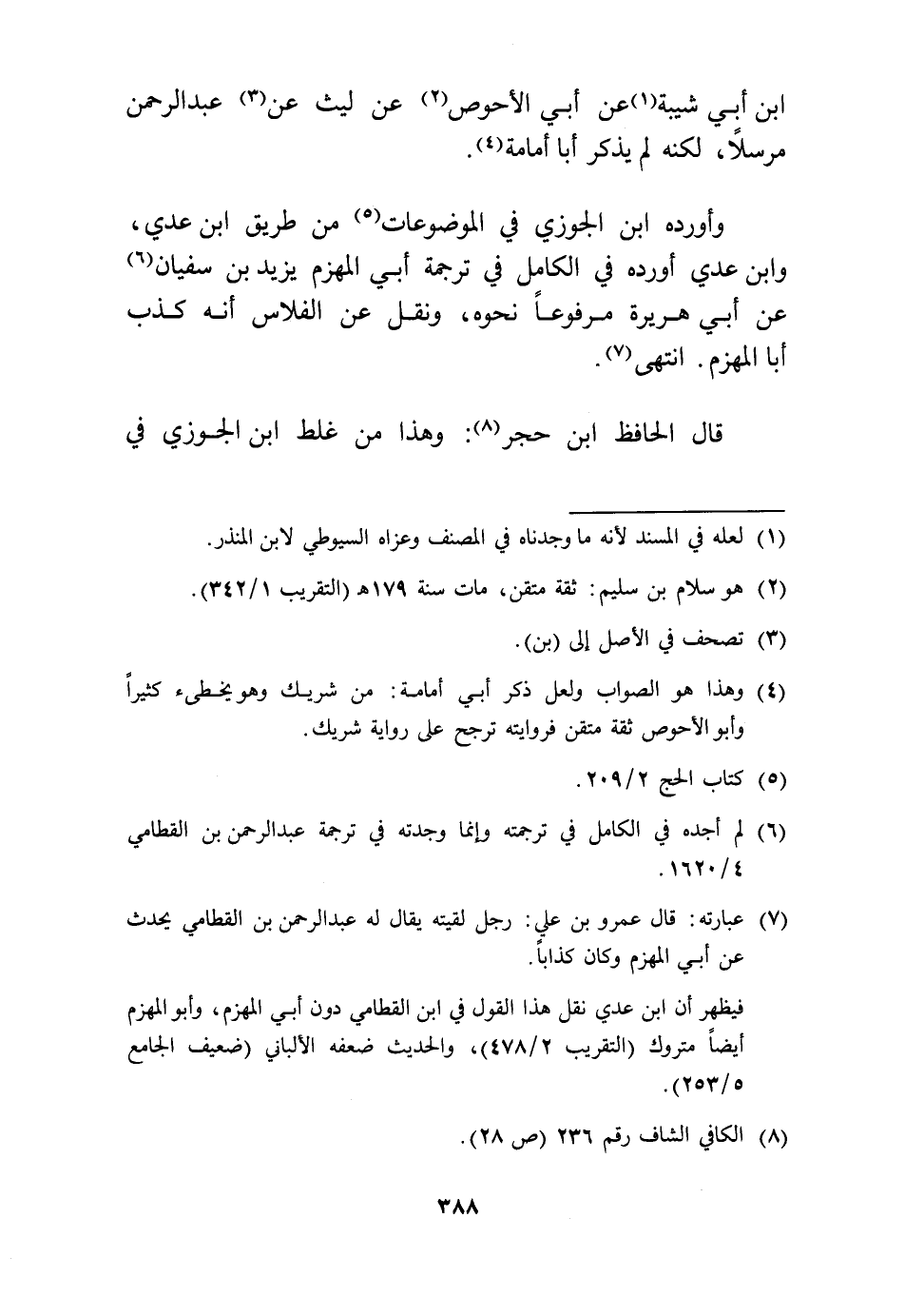 ابْن أبي شيبَة عَن أبي الْأَحْوَص عَن لَيْث عَن عبد الرَّحْمَن مُرْسلا، لكنه لم يذكر أَبَا أُمَامَة.