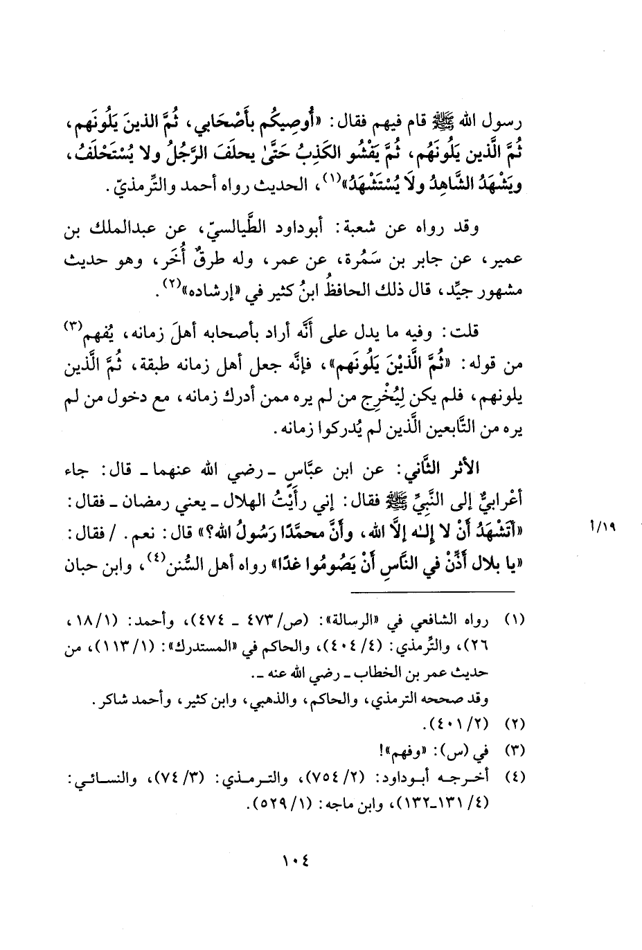 الأثر الثاني: عن ابن عبّاس -رضي الله عنهما- قال: جاء أعرابي إلى النّبيّ - صلى الله عليه وسلم - فقال: إني رأيت الهلال -يعني رمضان- فقال: ((أتشهد أنّ لا إله إلا الله, وأنّ محمداً رسول الله؟)) قال: نعم. /فقال: ((يا بلال أذّن في النّاس أن يصوموا غداً)) رواه أهل السّنن (¬4) , وابن حبان