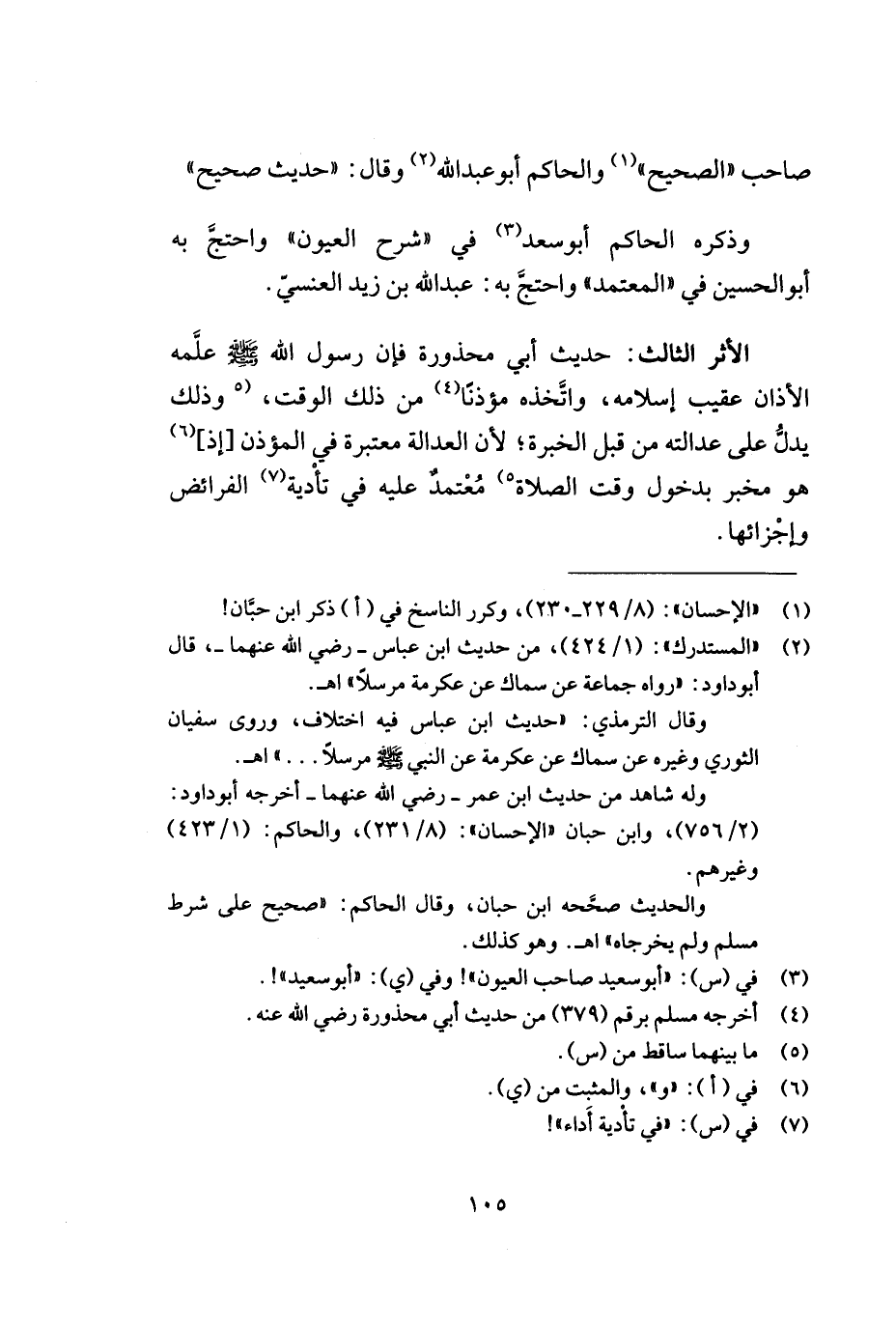 الأثر الثالث: حديث أبي محذورة فإن رسول الله - صلى الله عليه وسلم - علّمه الأذان عقيب إسلامه, واتّخذه مؤذناً (¬4) من ذلك الوقت, وذلك يدلّ على عدالته من قبل الخبرة؛ لأنّ العدالة معتبرة في المؤذن [إذ] (¬5) هو مخبر بدخول وقت الصلاة (¬6) معتمد عليه في تأدية (¬7) الفرائض وإجزائها.
