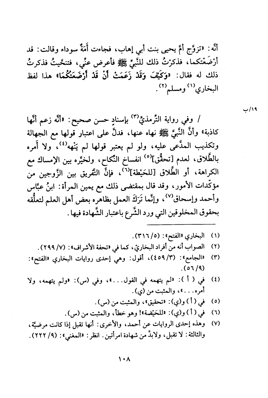 /وفي رواية التّرمذيّ (¬3) بإسناد حسن صحيح: ((أنه زعم أنّها كاذبة)) وأنّ النّبيّ - صلى الله عليه وسلم - نهاه عنها, فدلّ على اعتبار قولها مع الجهالة وتكذيب المدّعى عليه, ولو لم يعتبر قولها لم ينهه (¬4) , ولا أمره بالطّلاق, لعدم [تحقّق] (¬5) انفساخ النّكاح, ولخيّره بين الإمساك مع الكراهة, أو الطّلاق [للحيطة] (¬6) , فإنّ التّفريق بين الزّوجين من مؤكّدات الأمور, وقد قال بمقتضى ذلك مع يمين المرأة: ابن عبّاس وأحمد وإسحاق (¬7) , وإنّما ترك العمل بظاهره بعض أهل العلم لتعلّقه بحقوق المخلوقين التي ورد الشّرع باعتبار الشّهادة فيها.