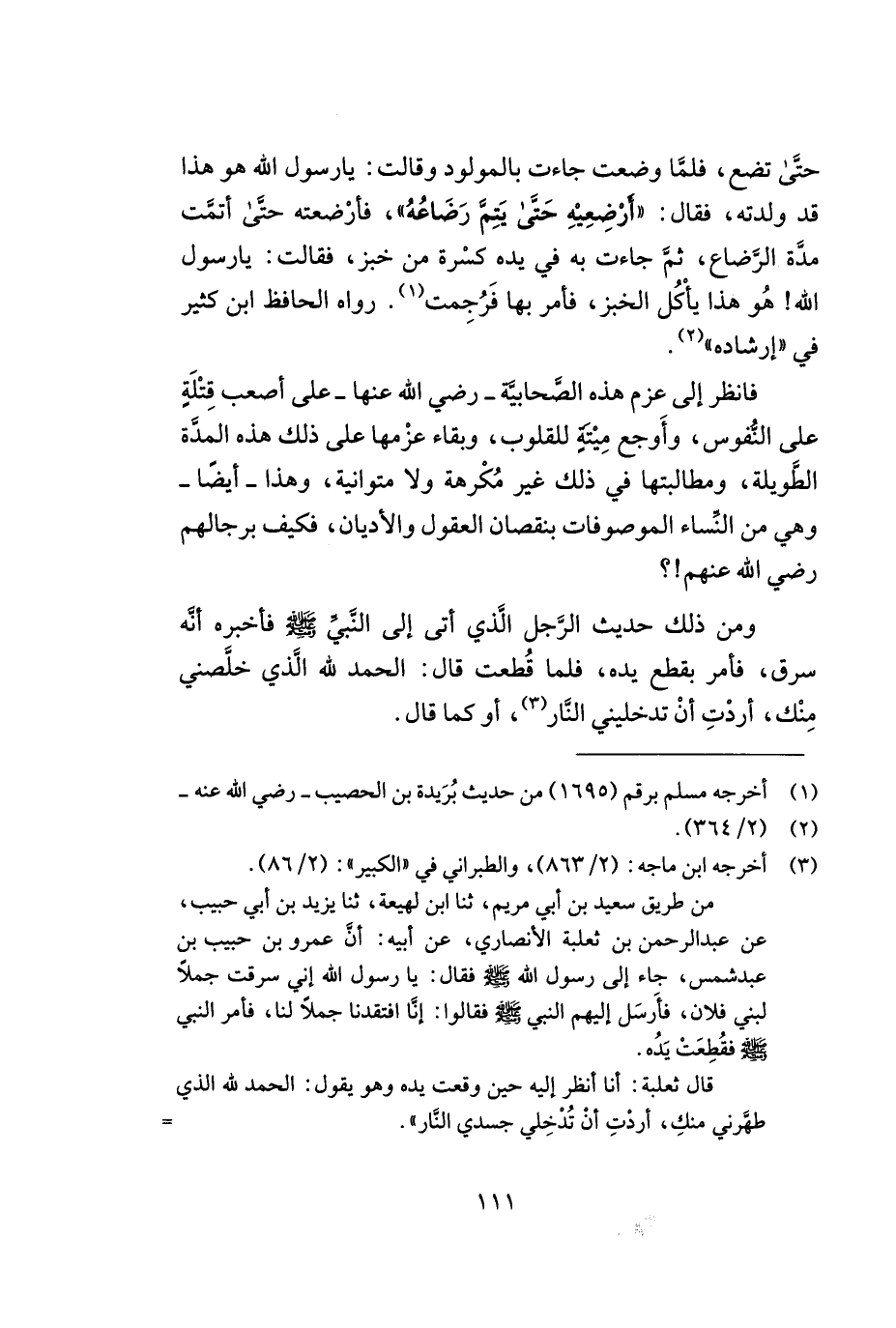 حتّى تضع, فلمّا وضعت جاءت بالمولود وقالت: يا رسول الله هو هذا قد ولدته, فقال: ((أرضعيه حتّى يتمّ رضاعه)) , فأرضعته حتّى أتمّت مدة الرّضاع, ثمّ جاءت به في يده كسرة من خبز, فقالت: يا رسول الله! هو هذا يأكل الخبز, فأمر بها فرجمت (¬1). رواه الحافظ ابن كثير في ((إرشاده)) (¬2).