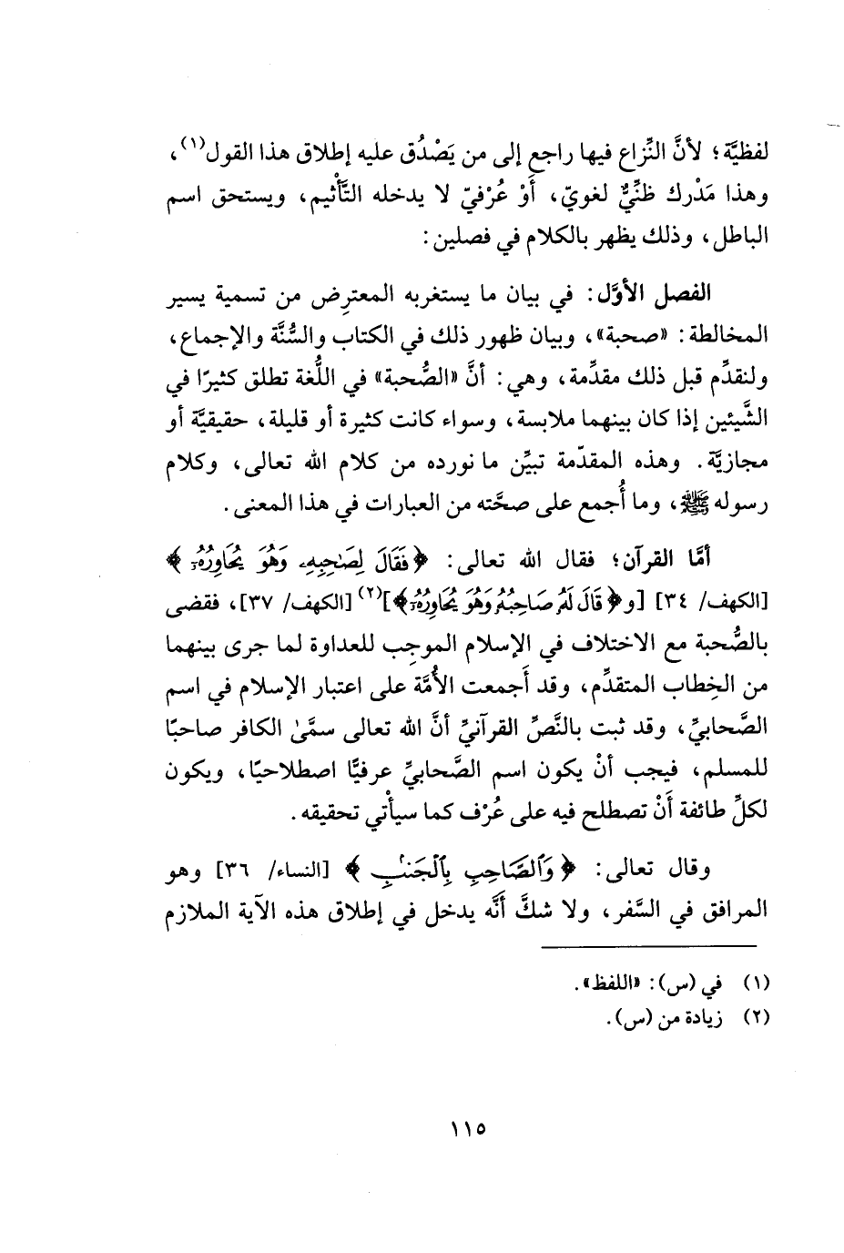 الفصل الأوّل: في بيان ما يستغربه المعترض من تسمية يسير المخالطة: ((صحبة)) , وبيان ظهور ذلك في الكتاب والسّنّة والإجماع, ولنقدّم قبل ذلك مقدّمة, وهي: أنّ ((الصّحبة)) في اللّغة تطلق كثيراً في الشّيئين إذا كان بينهما ملابسة, وسواء كانت كثيرة أو قليلة, حقيقيّة أو مجازيّة, وهذه المقدّمة تبيّن ما نورده من كلام الله تعالى, وكلام رسوله - صلى الله عليه وسلم - , وما أُجمع على صحّته من العبارات في هذا المعنى.