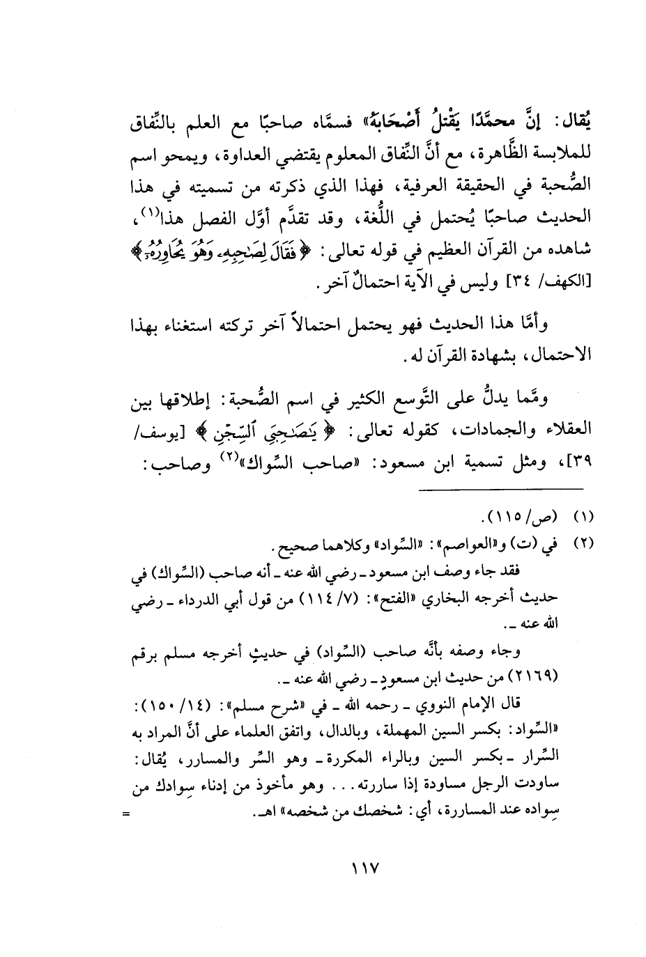 يقال: إنّ محمداً يقتل أصحابه)) فسمّاه صاحباً مع العلم بالنّفاق للملابسة الظّاهرة, مع أنّ النّفاق المعلوم يقتضي العداوة, ويمحو اسم الصّحبة في الحقيقة العرفية, فهذا الذي ذكرته من تسميته في هذا الحديث صاحباً يحتمل في اللّغة, وقد تقدّم أوّل الفصل هذا (¬1) , شاهده من القرآن العظيم في قوله تعالى: {فَقَالَ لِصَاحِبِهِ وَهُوَ يُحَاوِرُهُ} [الكهف:34]. وليس في الآية احتمال آخر.