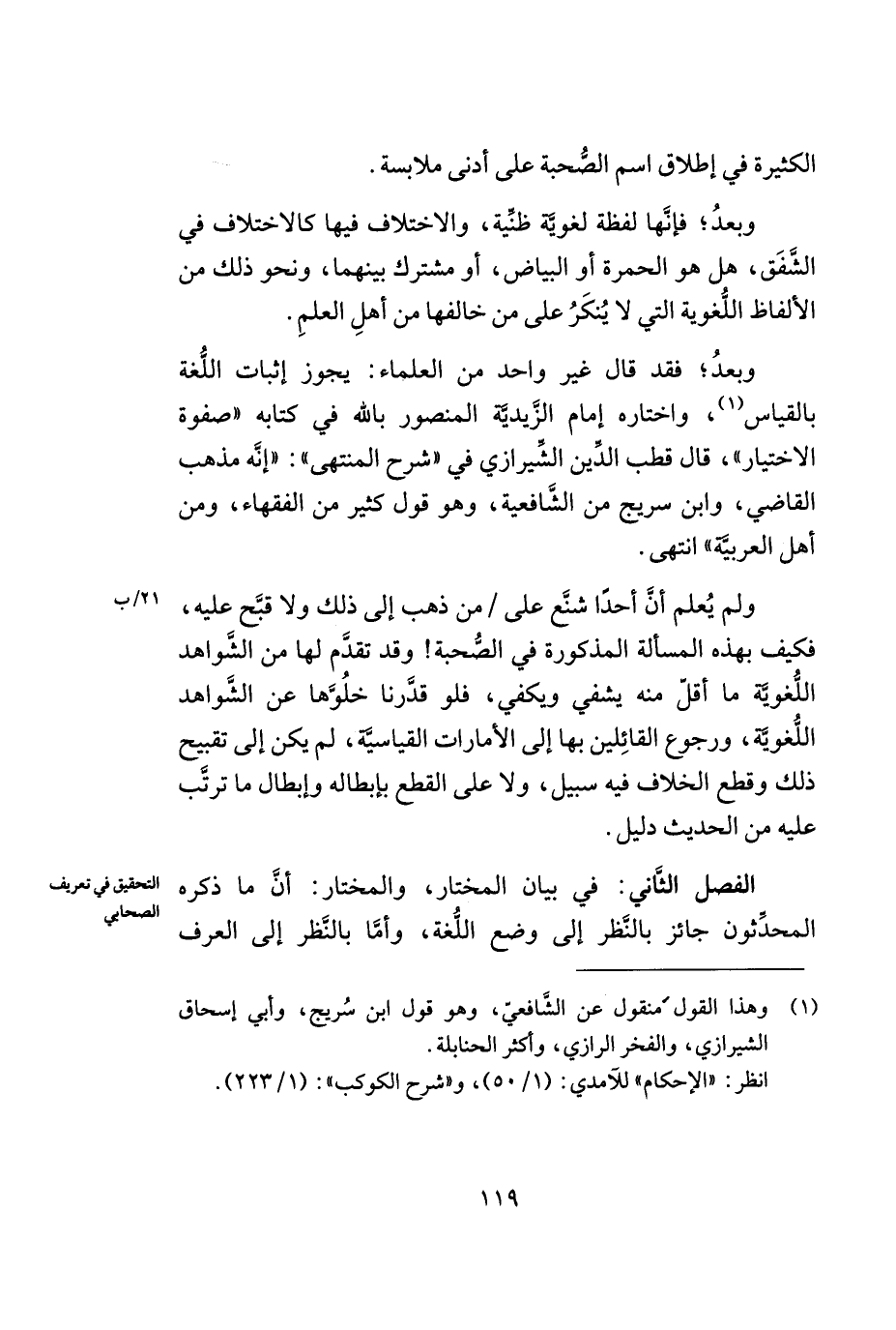 ولم يعلم أنّ أحداً شنّع على /من ذهب إلى ذلك ولا قبّح عليه, فكيف بهذه المسألة المذكورة في الصّحبة! وقد تقدّم لها من الشّواهد اللّغوية ما أقلّ منه يشفي ويكفي, فلو قدّرنا خلوّها عن الشّواهد اللّغوية, ورجوع القائلين بها إلى الأمارات القياسيّة, لم يكن إلى تقبيح ذلك وقطع الخلاف فيه سبيل, ولا على القطع بإبطاله وإبطال ما ترتّب عليه من الحديث دليل.