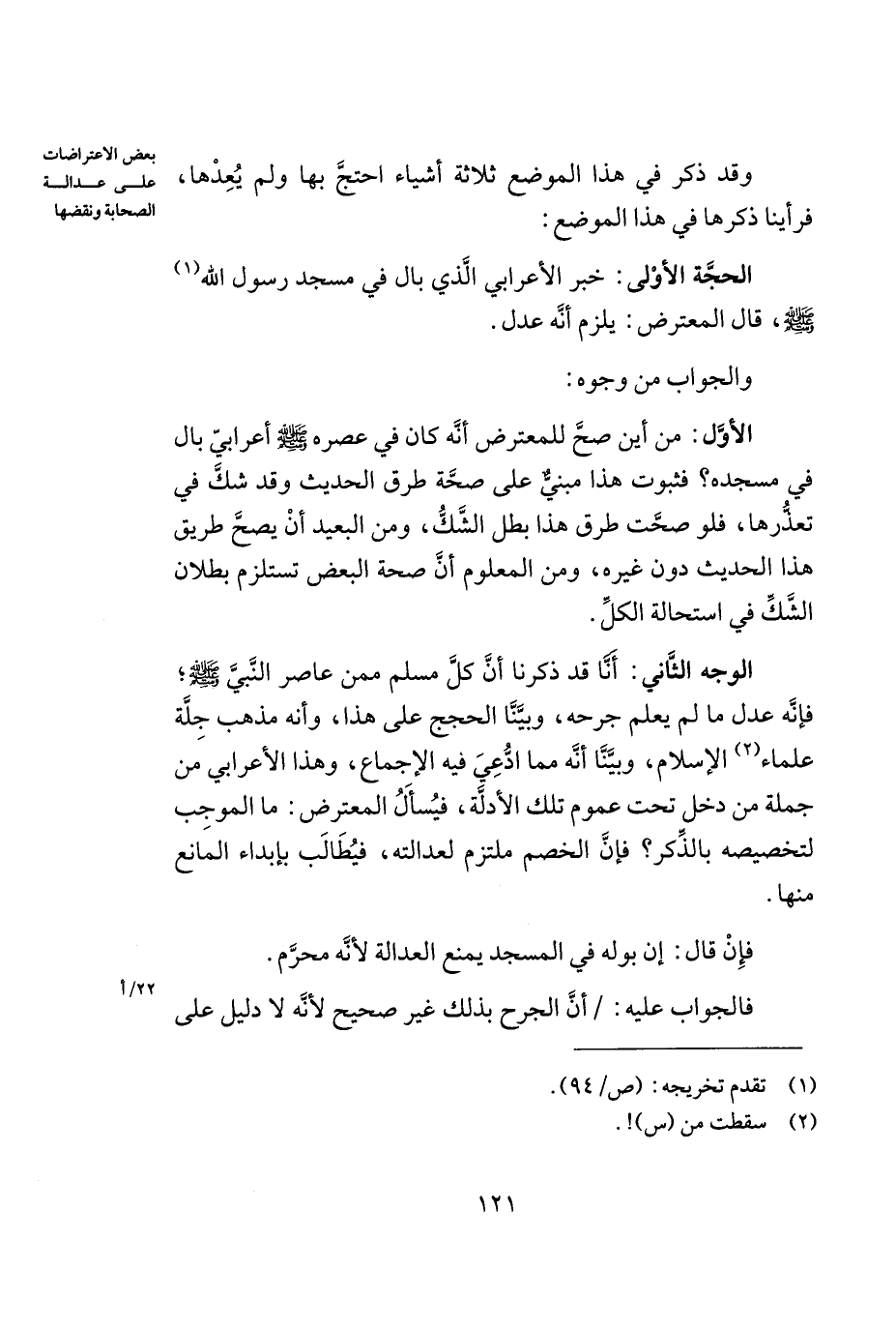الأوّل: من أين صحّ للمعترض أنّه كان في عصره - صلى الله عليه وسلم - أعرابي بال في مسجده؟ فثبوت هذا مبني على صحّة طرق الحديث وقد شكّ في تعذّرها, فلو صحّت طرق هذا بطل الشّكّ, ومن البعيد أن يصحّ طريق هذا الحديث دون غيره, ومن المعلوم أنّ صحة البعض تستلزم بطلان الشّكّ في استحالة الكلّ.