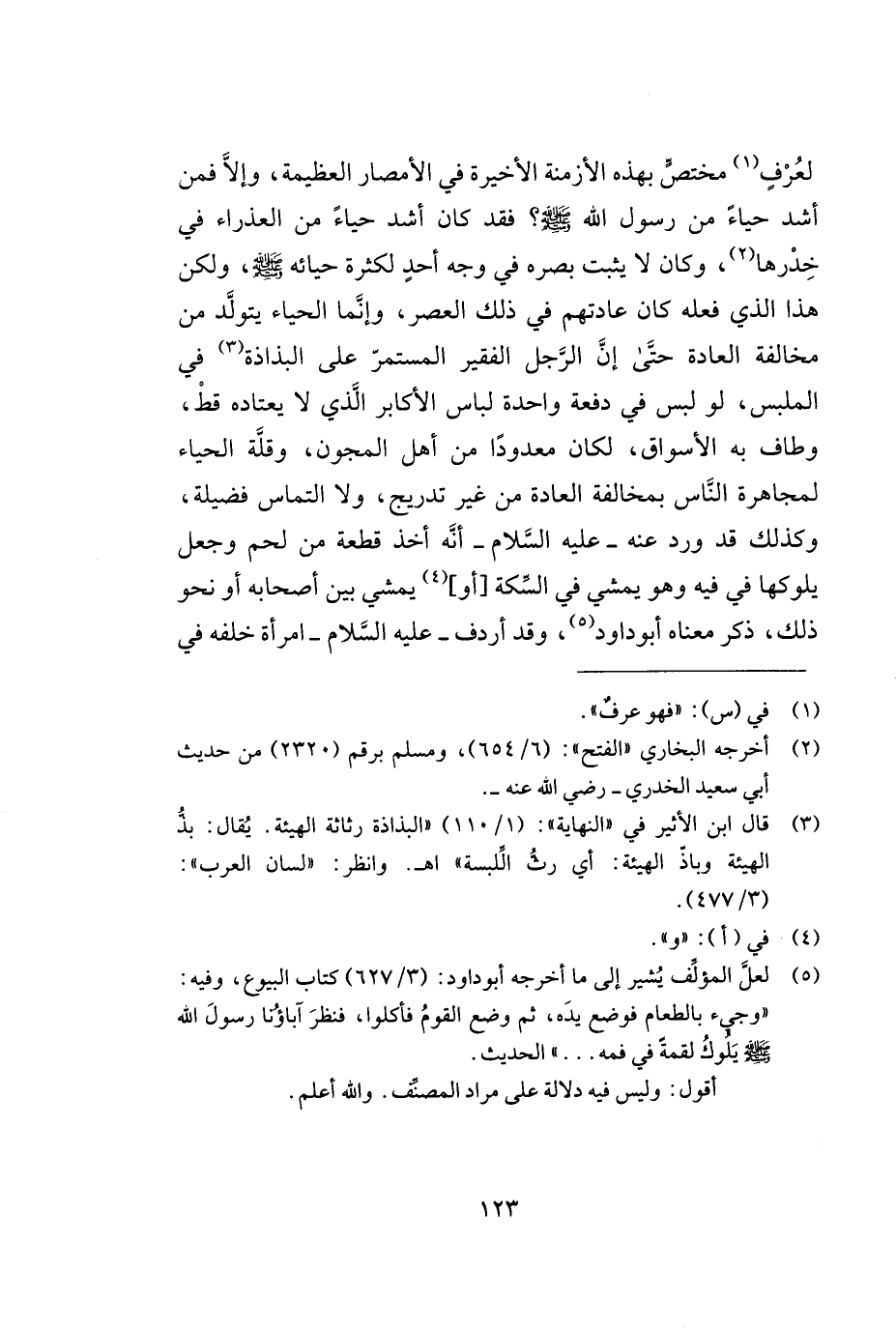 لعُرف (¬1) مختصّ بهذه الأزمنة الأخيرة في الأمصار العظيمة, وإلا فمن أشد حياء من رسول الله - صلى الله عليه وسلم -؟ فقد كان أشد حياء من العذراء في خدرها (¬2) , وكان لا يثبت بصره في وجه أحد لكثرة حيائه - صلى الله عليه وسلم - , ولكن هذا الذي فعله كان عادتهم في ذلك العصر, وإنّما الحياء يتولّد من مخالفة العادة حتّى إنّ الرّجل الفقير المستمرّ على البذاذة (¬3) في الملبس, لو لبس في دفعة واحدة لباس الأكابر الذي لا يعتاده قط, وطاف به الأسواق, لكان معدوداً من أهل المجون, وقلّة الحياء لمجاهرة النّاس بمخالفة العادة من غير تدريج, ولا التماس فضيلة, وكذلك قد ورد عنه - عليه السلام - أنّه أخذ قطعة من لحم وجعل يلوكها في فيه وهو يمشي في السّكة [أو] (¬4) يمشي بين أصحابه أو نحو ذلك, ذكر معناه أبو داود (¬5) , وقد أردف - عليه السلام - امرأة خلفه في