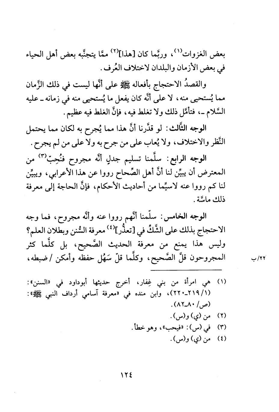 الوجه الرّابع: سلّمنا تسليم جدل أنّه مجروح فنحبّ (¬3) من المعترض أن يبيّن لنا أنّ أهل الصّحاح رووا عن هذا الأعرابي, ويبيّن لنا كم رووا عنه لا سيّما من أحاديث الأحكام, فإنّ الحاجة إلى معرفة ذلك ماسّة.