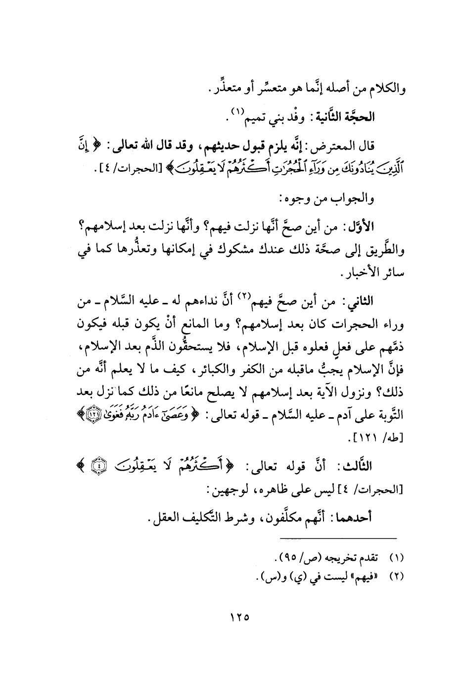 الثّاني: من أين صحّ فيهم (¬2) أن نداءهم له - عليه السلام - من وراء الحجرات كان بعد إسلامهم؟ وما المانع أن يكون قبله فيكون ذمّهم على فعل فعلوه قبل الإسلام, فلا يستحقّون الذّم بعد الإسلام, فإنّ الإسلام يجبّ ما قبله من الكفر والكبائر, كيف ما لا يعلم أنّه من ذلك؟ ونزول الآية بعد إسلامهم لا يصلح مانعاً في ذلك كما نزل بعد التّوبة على آدم - عليه السلام - قوله تعالى: قوله تعالى: {وَعَصَى آدَمُ رَبَّهُ فَغَوَى} [طه:121].