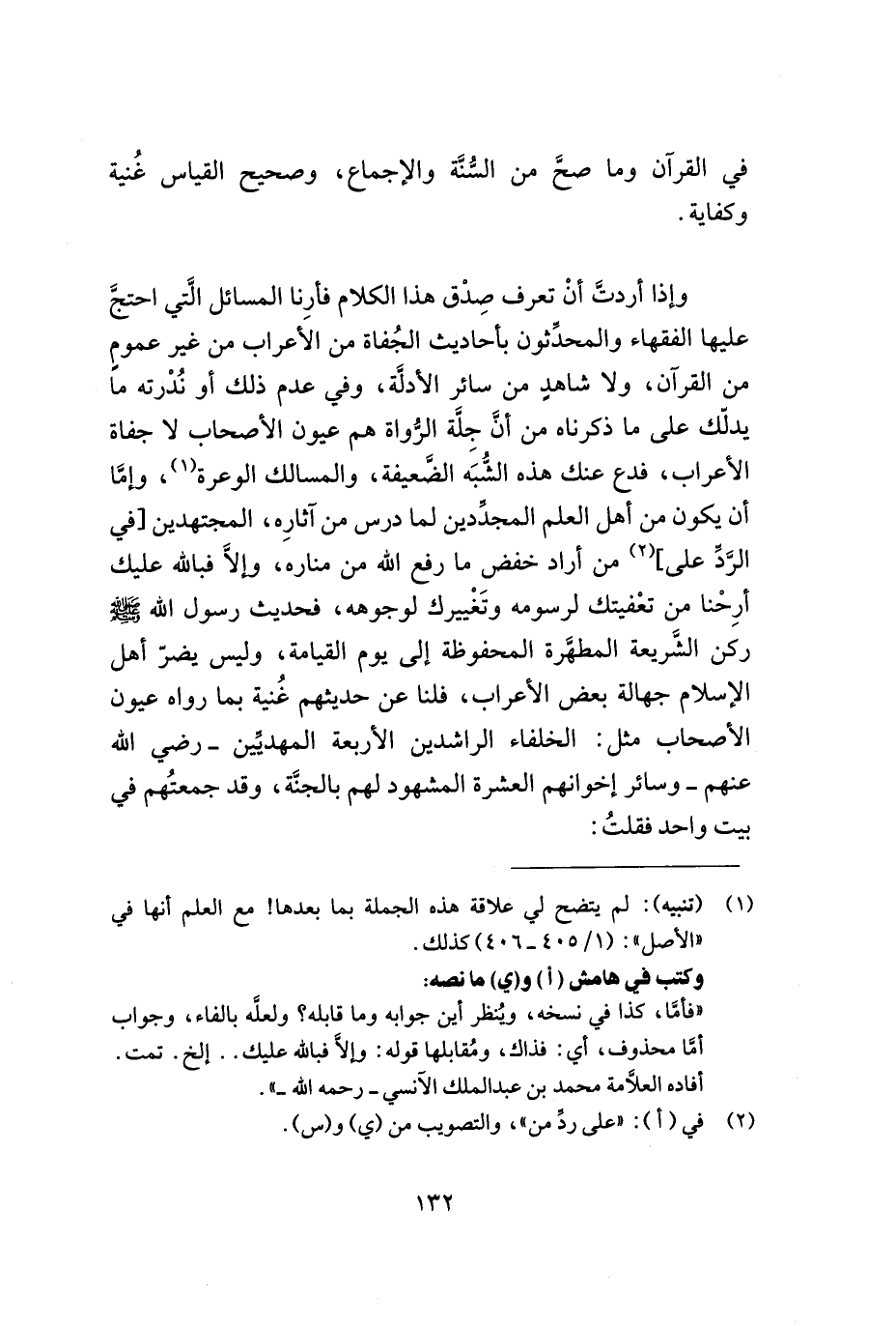 وإذا أردتّ أن تعرف صدق هذا الكلام فأرنا المسائل التي احتجّ عليها الفقهاء والمحدّثون بأحاديث الجفاة من الأعراب من غير عموم من القرآن, ولا شاهد من سائر الأدلّة, وفي عدم ذلك أو نذرته ما يدلّك على ما ذكرناه من أنّ جلّة الرّواة هم عيون الأصحاب لا جفاة الأعراب, فدع عنك هذه الشّبه الضّعيفة, والمسالك الوعرة (¬1) , وإمّا أن يكون من أهل العلم المجدّدين لما درس من آثاره, المجتهدين [في الردّ على] (¬2) من أراد خفض ما رفع الله من مناره, وإلا فبالله عليك أرحنا من تعفيتك لرسومه وتغييرك لوجوهه, فحديث رسول الله - صلى الله عليه وسلم - ركن الشريعة المطهّرة المحفوظة إلى يوم القيامة, وليس يضرّ أهل الإسلام جهالة بعض الأعراب, فلنا من حديثهم غنية بما رواه عيون الأصحاب مثل: الخلفاء الراشدين الأربعة المهديّين -رضي الله عنهم- وسائر إخوانهم العشرة المشهود لهم بالجنّة, وقد جمعتهم في بيت واحد فقلت: