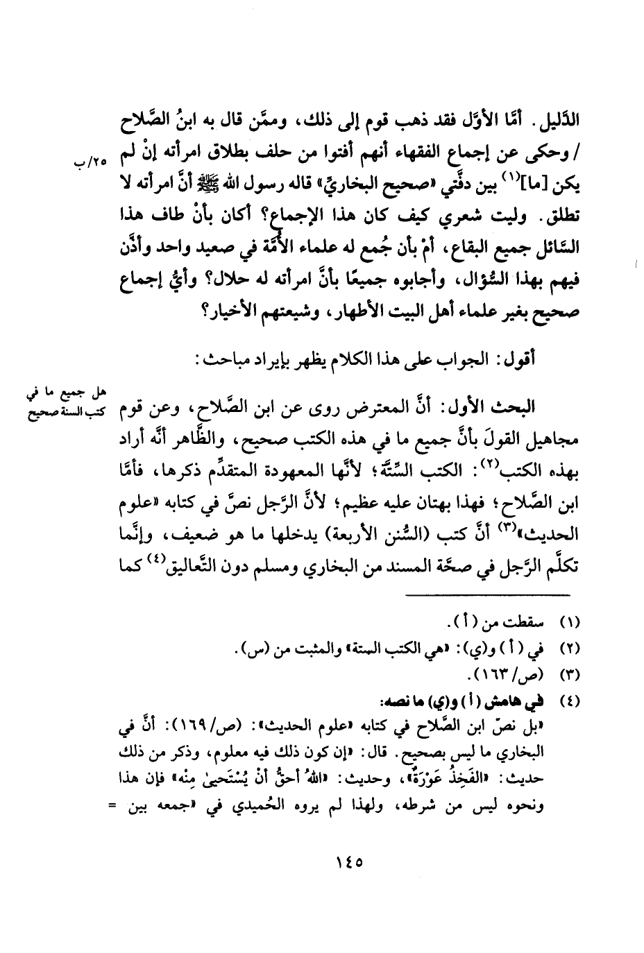 البحث الأوّل: أنّ المعترض روى عن ابن الصّلاح, وعن قوم مجاهيل القول بأنّ جميع ما في هذه الكتب صحيح, والظّاهر أنّه أراد بهذه الكتب (¬2): الكتب السّتّة؛ لأن الرّجل نصّ في كتابه ((علوم الحديث)) (¬3) أنّ كتب (السّنن الأربعة) يدخلها ما هو ضعيف, وإنّما تكلّم الرّجل في صحّة المسند من البخاري ومسلم دون التّعاليق (¬4)