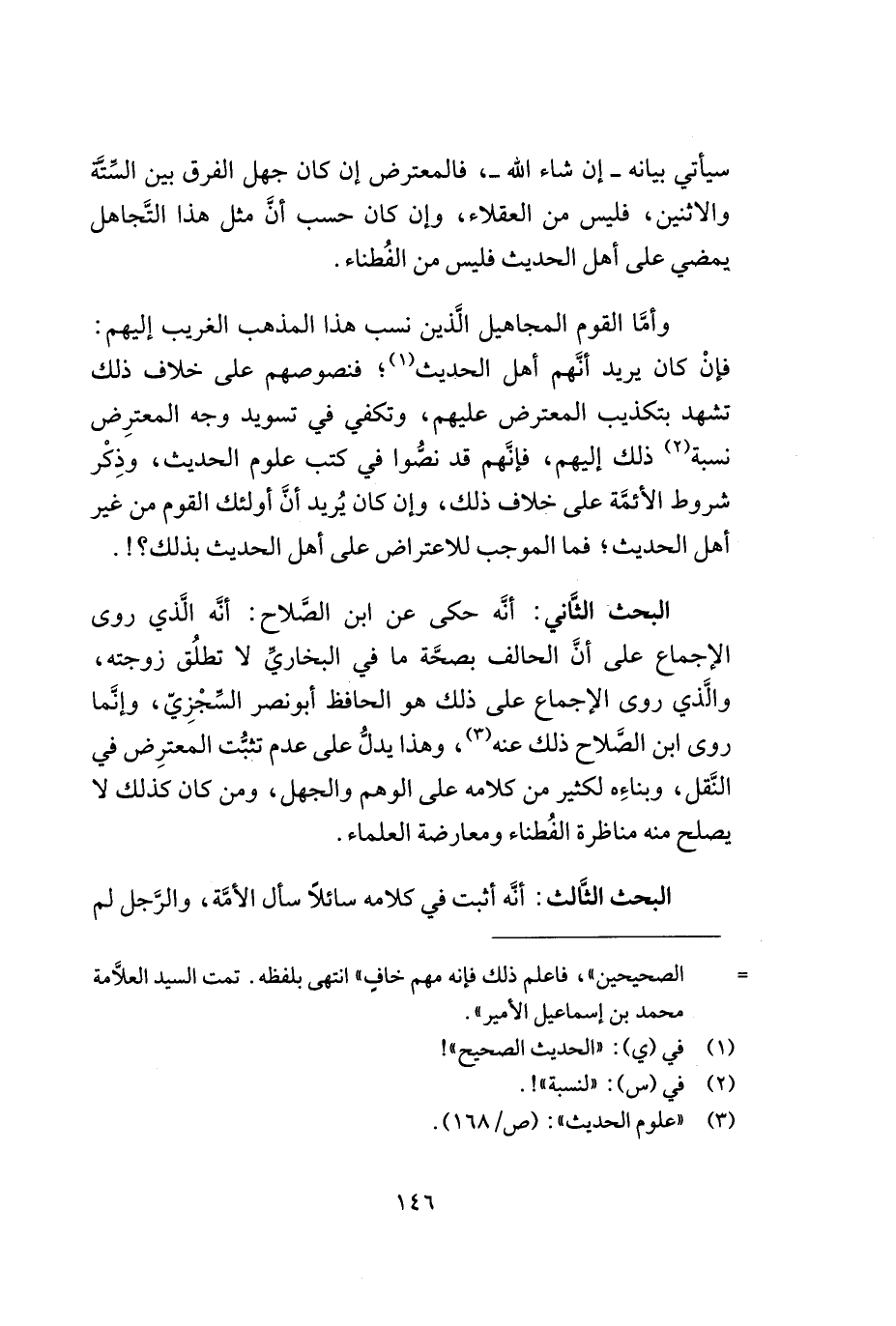 البحث الثاني: أنّه حكى عن ابن الصّلاح: أنّه الذي روى الإجماع على أنّ الحالف بصحّة ما في البخاريّ لا تطلق زوجته, والذي روى الإجماع على ذلك هو الحافظ أبو نصر السّجزيّ, وإنّما روى ابن الصّلاح ذلك عنه (¬3) , وهذا يدلّ على عدم تثبّت المعترض في النّقل, وبناءه لكثير من كلامه على الوهم والجهل, ومن كان كذلك لا يصلح منه مناظرة الفطناء ومعارضة العلماء.