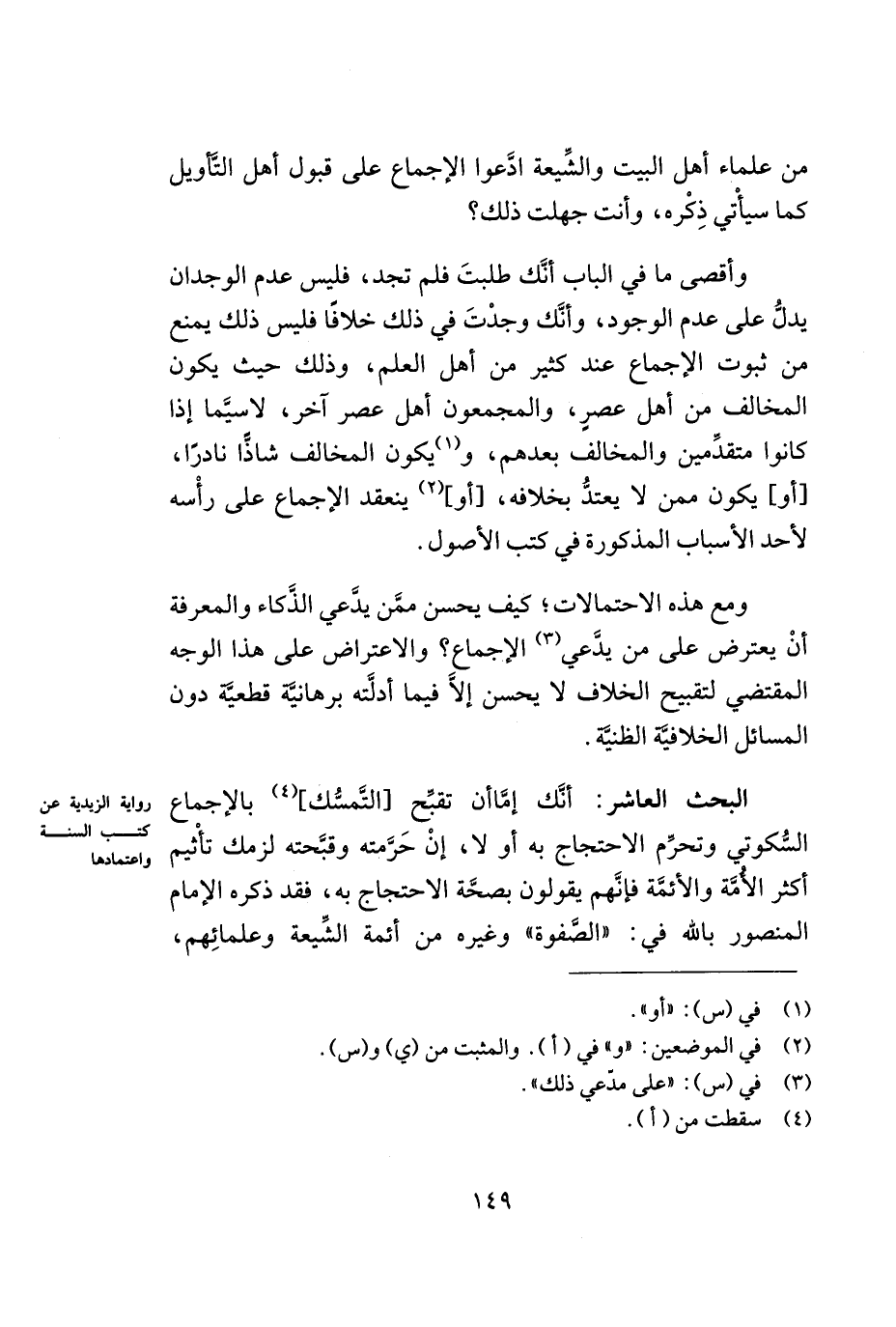 البحث العاشر: أنّك إمّا أن تقبّح [التّمسّك] (¬4) بالإجماع السّكوتي وتحرّم الاحتجاج له أو لا, إن حرّمته وقبّحته لزمك تأثيم أكثر الأمّة والأئمّة فإنّهم يقولون بصحّة الاحتجاج به, فقد ذكره الإمام المنصور بالله في: ((الصّفوة)) وغيره من أئمة الشّيعة وعلمائهم,