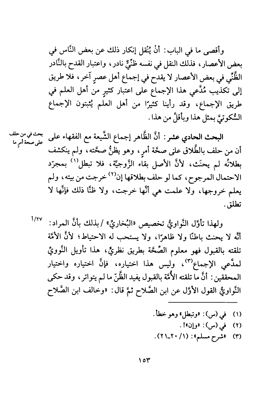 ولهذا تأوّل النّواويّ تخصيص ((البخاري)) /بذلك بأنّ المراد: أنّه لا يحنث باطناً ولا ظاهراً, ولا يستحب له الاحتياط؛ لأنّ الأمّة تلقته بالقبول فهو معلوم الصّحّة بطريق نظريّ, هذا تأويل النّوويّ لمدّعي الإجماع (¬3) , وليس هذا اختياره, فإنّ اختياره واختيار المحققين: أنّ ما تلقته الأمّة بالقبول يفيد الظّنّ ما لم يتواتر, وقد حكى النّواويّ القول الأوّل عن ابن الصّلاح ثمّ قال: ((وخالف ابن الصّلاح