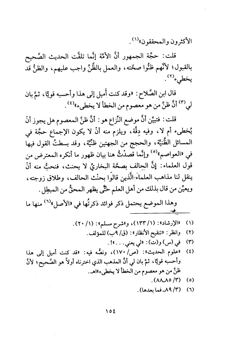 (¬4) ((علوم الحديث)): (ص/170) , ونصّه فيه: ((قد كنت أميل إلى هذا وأحسبه قويّاً, ثمّ بان لي أنّ المذهب الذي اخترناه أولاً هو الصّحيح؛ لأنّ ظنّ من هو معصوم من الخطأ لا يخطىء)) اهـ.