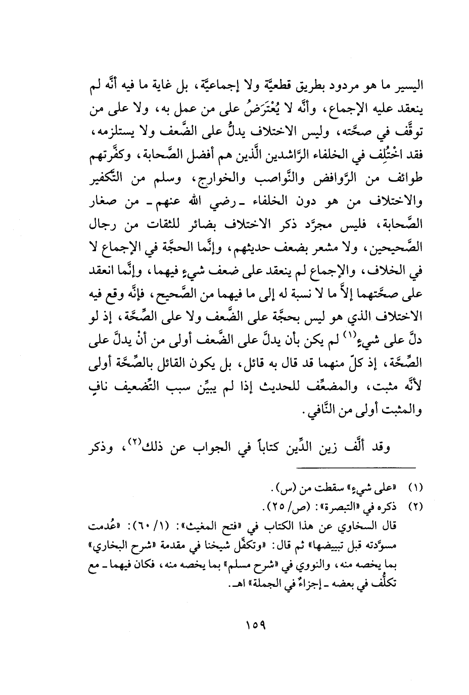 اليسير ما هو مردود بطريق قطعيّة ولا إجماعيّة, بل غاية ما فيه أنّه لم ينعقد عليه الإجماع, وأنّه لا يعترض على من عمل به, ولا على من توقّف في صحّته, وليس الاختلاف يدلّ على الضّعف ولا يستلزمه, فقد اختلف في الرّاشدين الذين هم أفضل الصّحابة, وكفّرتهم طوائف الرّوافض والنّواصب والخوارج, وسلم من التّكفير والاختلاف من هو دون الخلفاء -رضي الله عنهم- من صغار الصّحابة, فليس مجرّد ذكر الاختلاف بضائر للثقات من رجال الصّحيحين, ولا مشعر بضعف حديثهم, وإنّما الحجّة في الإجماع لا في الخلاف, والإجماع لم ينعقد على ضعف شيء فيهما, وإنّما انعقد على صحّتهما إلا ما لا نسبة له إلى ما فيهما من الصّحيح, فإنّه وقع فيه الاختلاف الذي هو ليس بحجّة على الضّعف ولا على الصّحّة, إذ لو دلّ على شيء (¬1) لم يكن بأن يدلّ على الضّعف أولى من أن يدلّ على الصّحّة, إذ كلّ منهما قد قال به قائل, بل يكون القائل بالصّحّة أولى لأنّه مثبت, والمضعّف للحديث إذا لم يبيّن سبب التّضعيف ناف والمثبت أولى من النّافي.